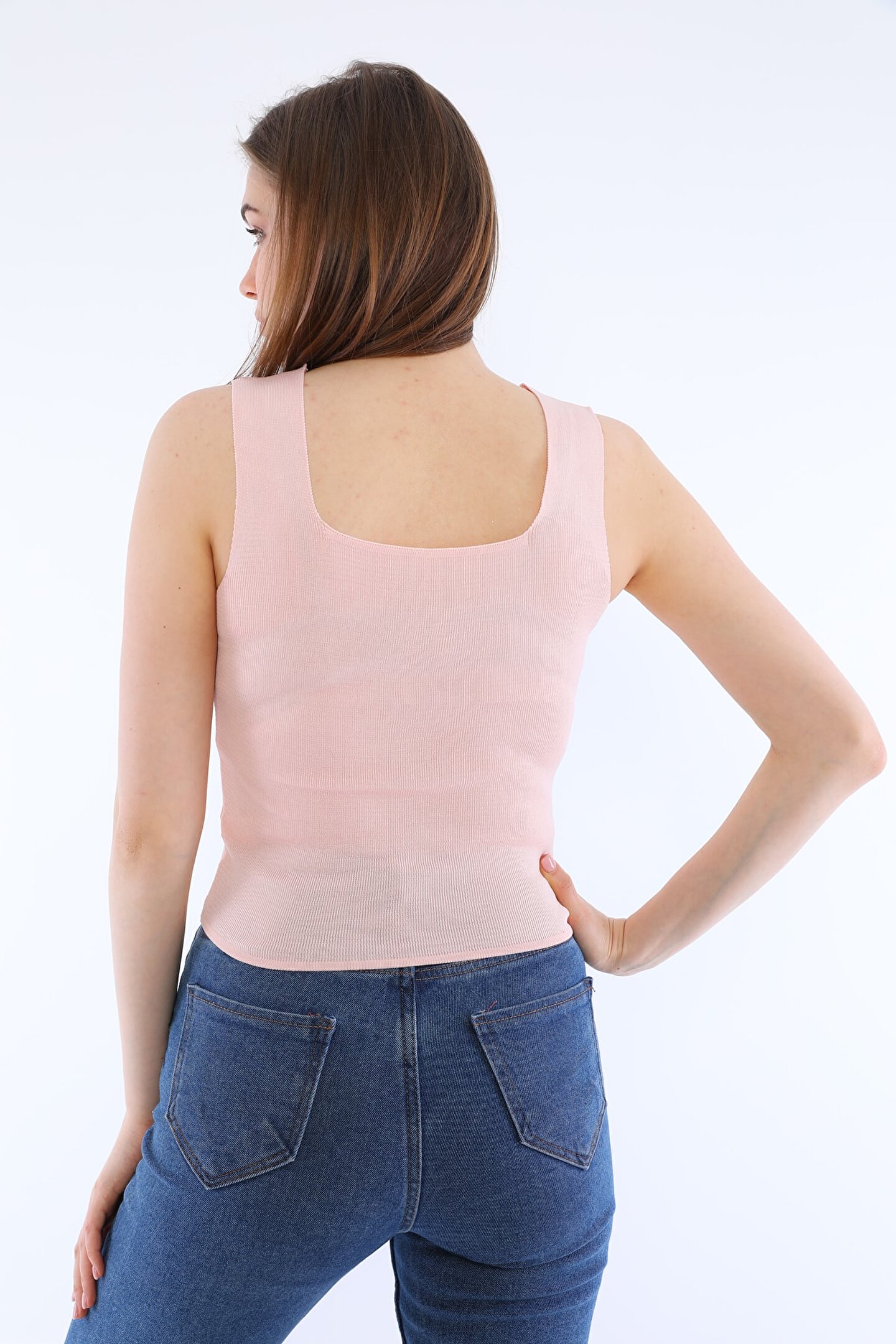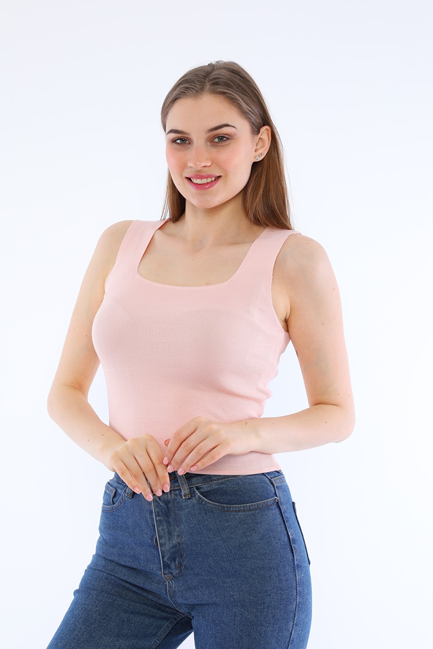 ByElits Kadın Pembe Kolsuz Bluz Kalın Askılı Atlet Ince Yazlık Kare Yaka Triko