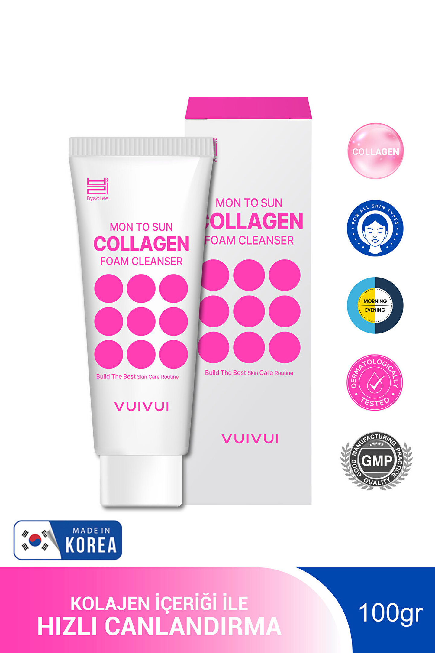Cildinizin temiz, yumuşak ve pürüzsüz görünmesini mi istiyorsunuz? Byeolee kolajen foam cleanser yüz temizleme köpüğü 100gr tam size göre! Bu köpük, içeriğindeki hidrolize kolajen sayesinde cildinizi nazikçe temizlerken aynı zamanda nemlendirir, yumuşatır ve pürüzsüzleştirir. ByeoleeKolajen foam cleanser yüz temizleme köpüğü 100gr faydaları: Nazik temizlik: Köpük formülü, cildinizdeki kiri, yağı ve makyaj kalıntılarını nazikçe temizler. ; Yoğun nemlendirme: Hidrolize kolajen, cildinizin nem seviyesini arttırır ve uzun süre nemli kalmasını sağlar. ; Yumuşaklık ve pürüzsüzlük: Köpük formülü, cildinizin yumuşak ve pürüzsüz olmasını sağlar. ; Elastiklik ve sıkılık: Hidrolize kolajen, cildin elastikiyetini artırır ve cildinizin daha sıkı görünmesini sağlar. ; Kırışıklık karşıtı: Hidrolize kolajen, cildin derin katmanlarına nüfuz ederek kırışıklıkların görünümünü azaltmaya yardımcı olur. ; Tüm cilt tipleri için uygundur: Hassas ciltler dahil olmak üzere tüm cilt tipleri için güvenle kullanılabilir. ; ByeoleeKolajen foam cleanser yüz temizleme köpüğü 100gr nasıl kullanılır: Islak ellerinize uygun miktarda ürünü alın. ; Köpürene kadar ellerinizle ovalayın. ; Köpüğü yüzünüze ve boynunuza nazikçe masaj yaparak uygulayın. ; Ilık suyla durulayın. ; Günde iki kez, sabah ve akşam kullanın. ; ByeoleeKolajen foam cleanser yüz temizleme köpüğü 100gr , cildinizi nazikçe temizlerken aynı zamanda nemlendirir, yumuşatır, pürüzsüzleştirir ve kırışıklık görünümünü azaltır. Içindekiler: Aqua, palmitic acid, stearic acid, myristic acid, potassium hydroxide, glycerin, lauric acid, cocamidopropyl betaine, cocamide mea, phenoxyethanol, glyceryl stearate, peg-100 stearate, sodium chloride, disodium edta, parfum, capric acid, allantoin, hydrolyzed collagen, butylene glycol Kolajen, cildin elastikiyetinden ve parlaklığından sorumludur. Amino asitlerden oluşan bir protein olarak vücudumuz için gerekli olan önemli lifli proteinlerden biridir ve cilt, kemik, kas ve bağlar gibi vücudu oluşturmada gerekli bir rol oynar. Cildin elastikiyetini ve parlaklığını korur, yaşlanmayı önler ve cildi yenileme ve restore etme rolü oynar. • Cilde beslenme sağlar, cildi pürüzsüz ve parlak hale getirir• Gözenekleri küçültür ve cilt elastikiyetini artırır• Cilde hidrasyon sağlar• Cilt esnekliğini artırır ve cildi yumuşak tutar• Cilt bariyerini güçlendirir