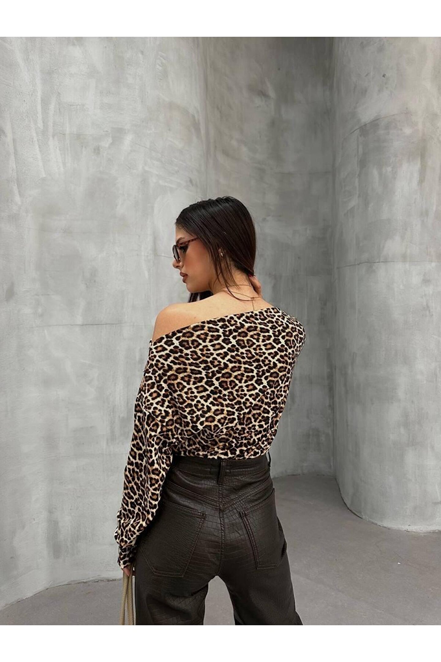 Kadın Leopar Desenli Düşük Omuzlu Bluz