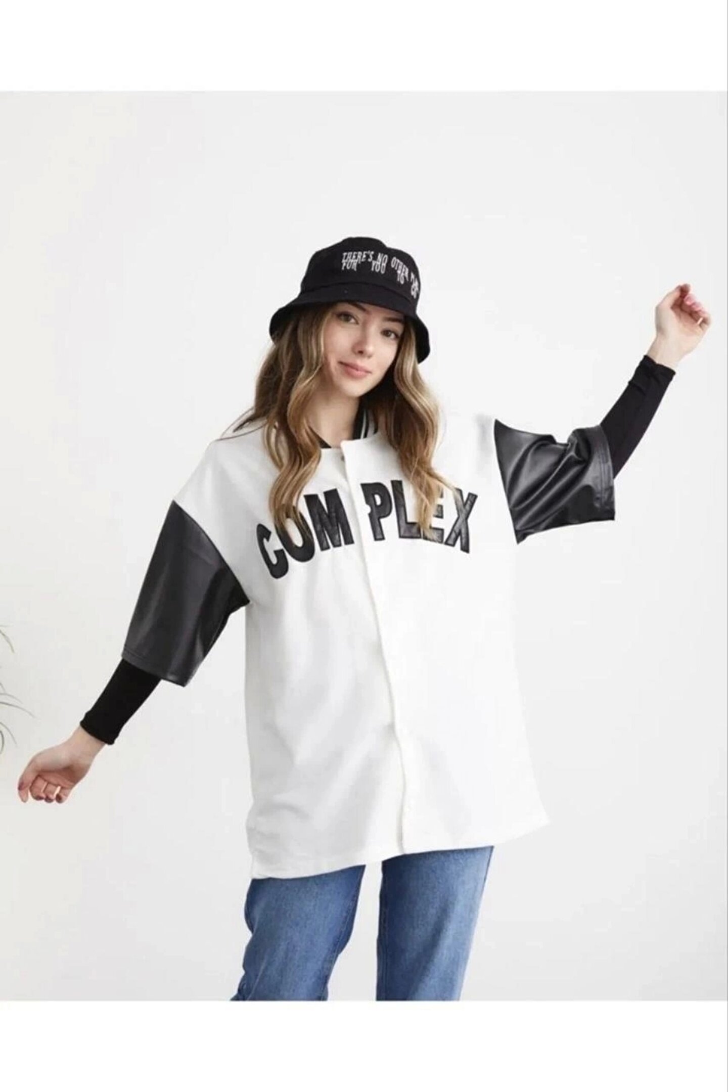 BYNPOL Kadın Complex Kolları Deri Kolej Oversize T-shirt - Beyaz