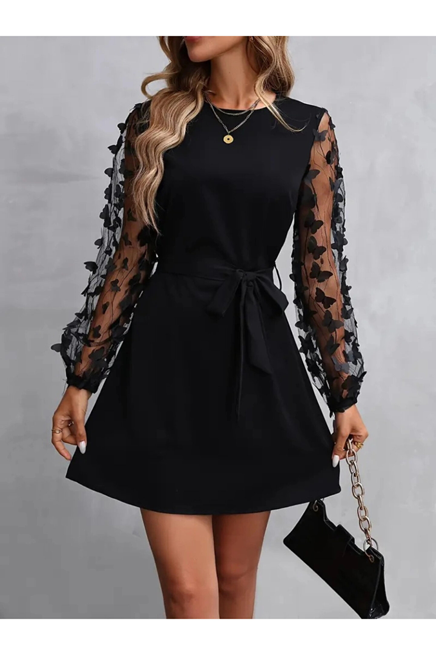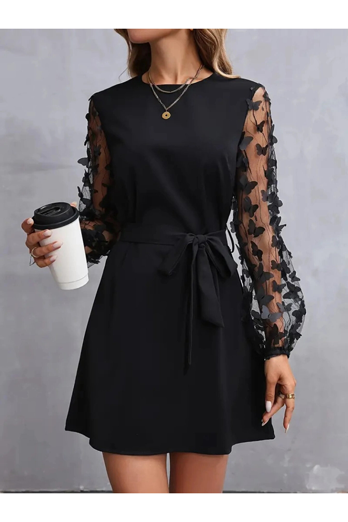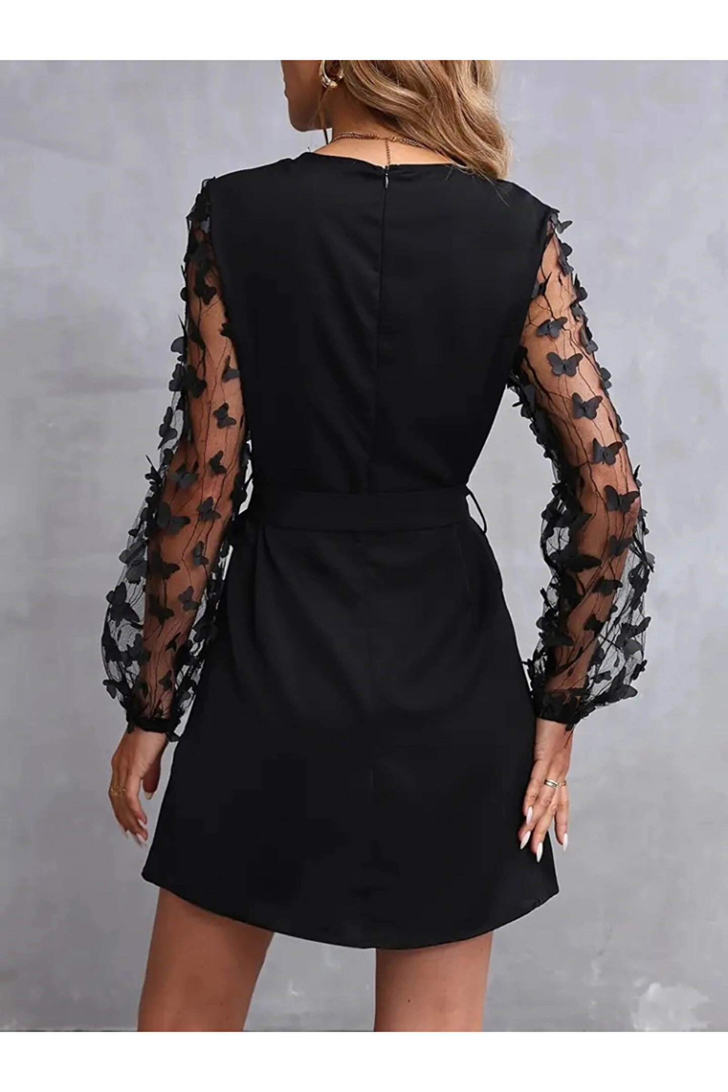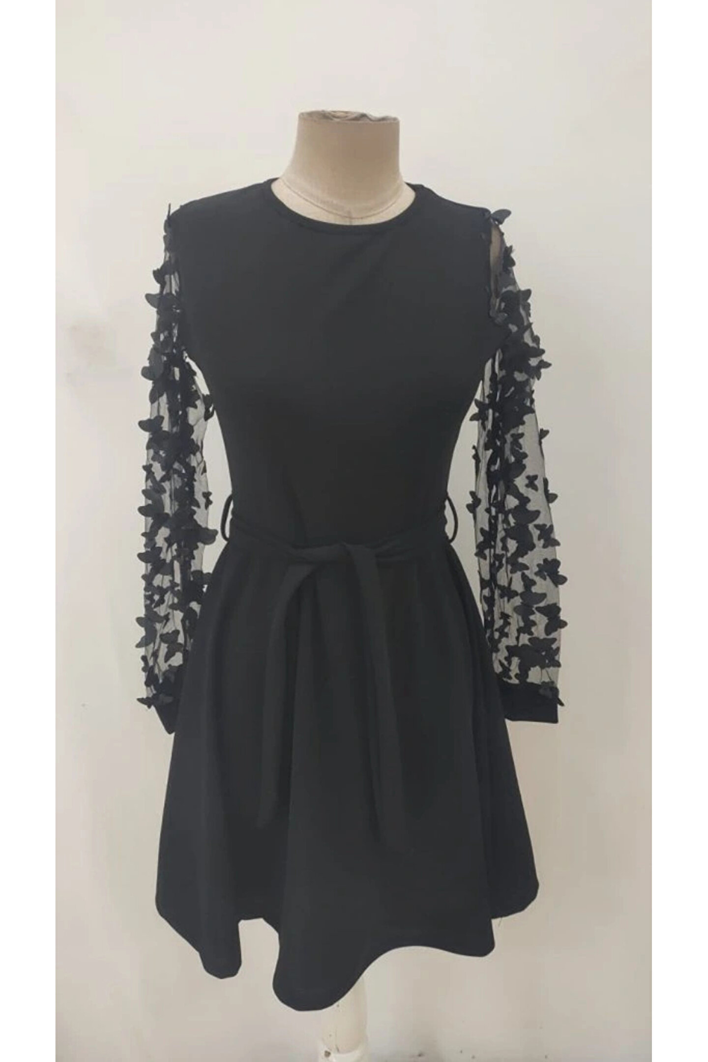 bysocafashion Kadın Uzun Kollu Bisiklet Yaka Kollar Tül Kelebek Detaylı Ithal Krep Elbise