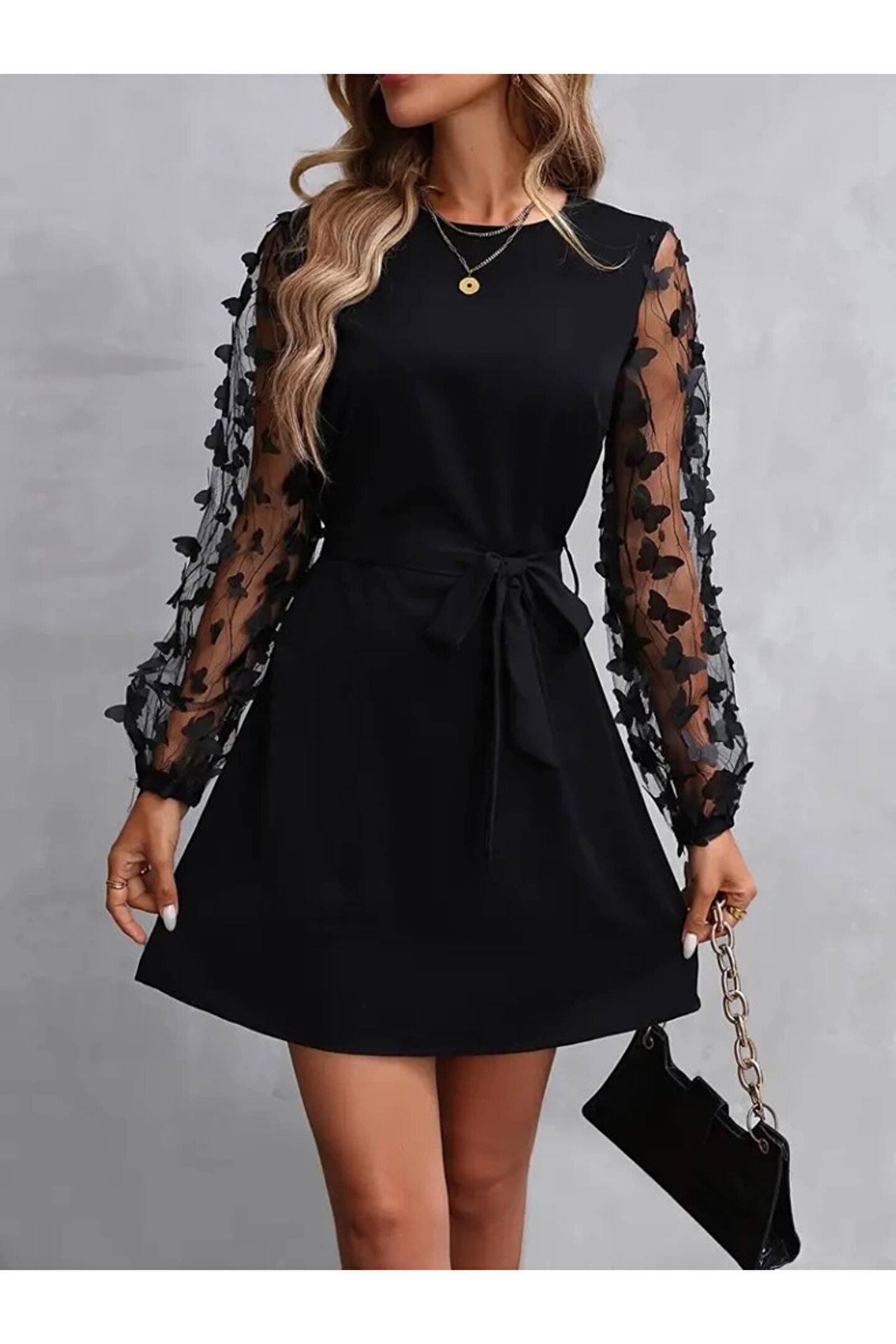 MDB Kadın Uzun Kollu Bisiklet Yaka Kollar Tül Kelebek Detaylı Ithal Krep Elbise