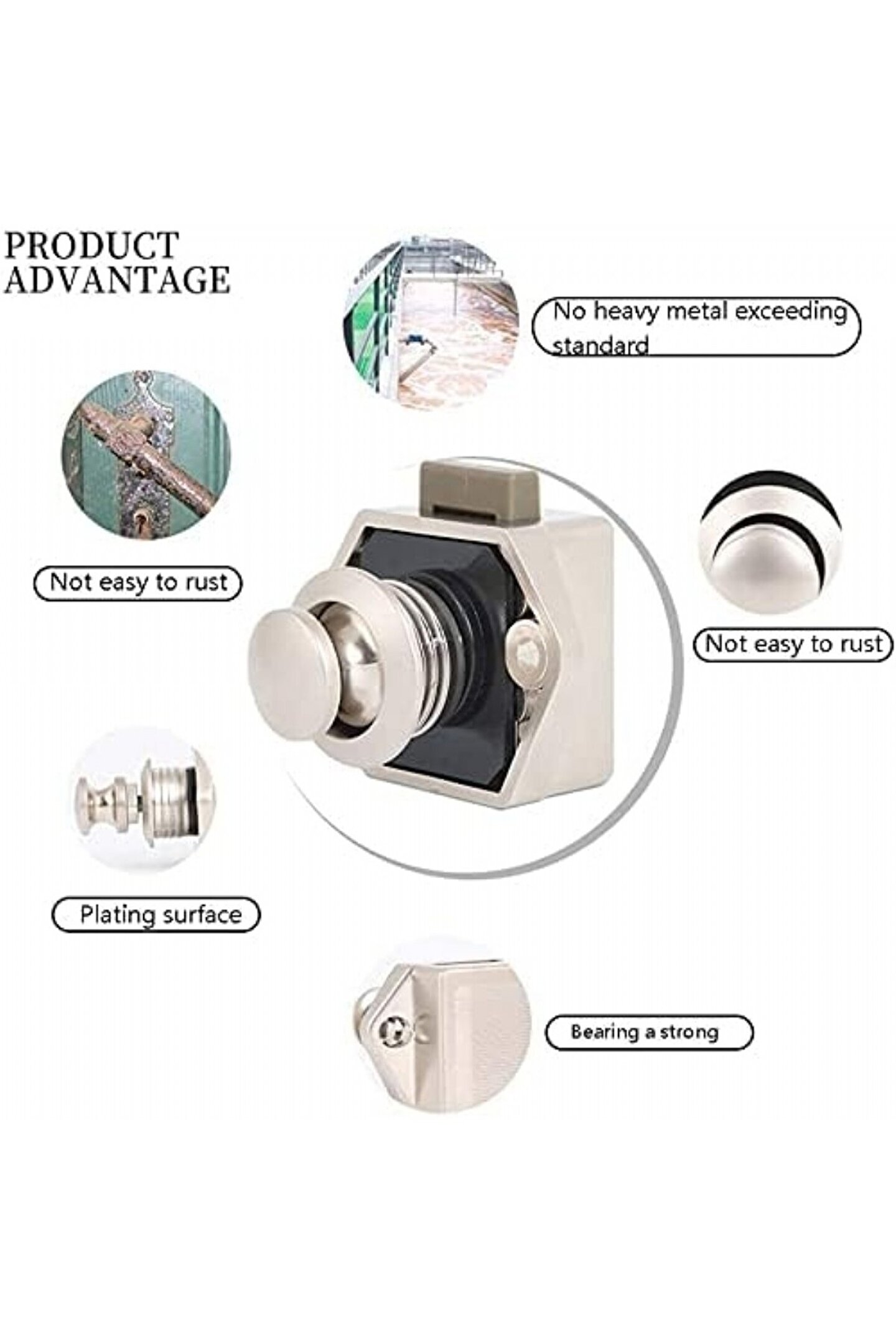 Bu basmalı buton kilit kapı kilidi galvanik çinko kaplama alaşımdan ve ABS'den oluşur, böylece kilidin daha uzun ömürlü ve daha hafif olması sağlanır.; Kilit kilidin dil/kilidin kilidine ve kapıya uygun konuma doğru uyarlanırsa iyi çalışır. Anahtara ihtiyacınız yok, kolay kurulum, sorunsuz açma ve kapama.; Kilidi sadece düğmeye basın, dilinizi aşağı kilitleyin, kapıyı açmak için düğmeyi çekin, düğmeler ayrıca kapıları açmak ve kilitlemek için kullanılabilir.; Bu metal basma butonu kilit 15 ila 27 mm kalınlıktaki dolaplar için. ;