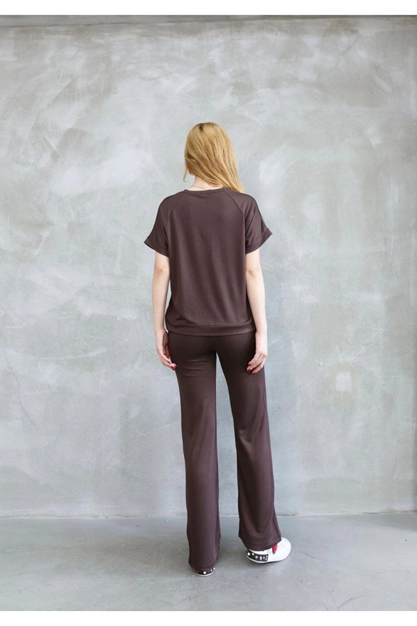 Osy Modal Yumuşak dokulu Kumaş Bisiklet Yaka Kısa Kollu Takım - Kahverengi