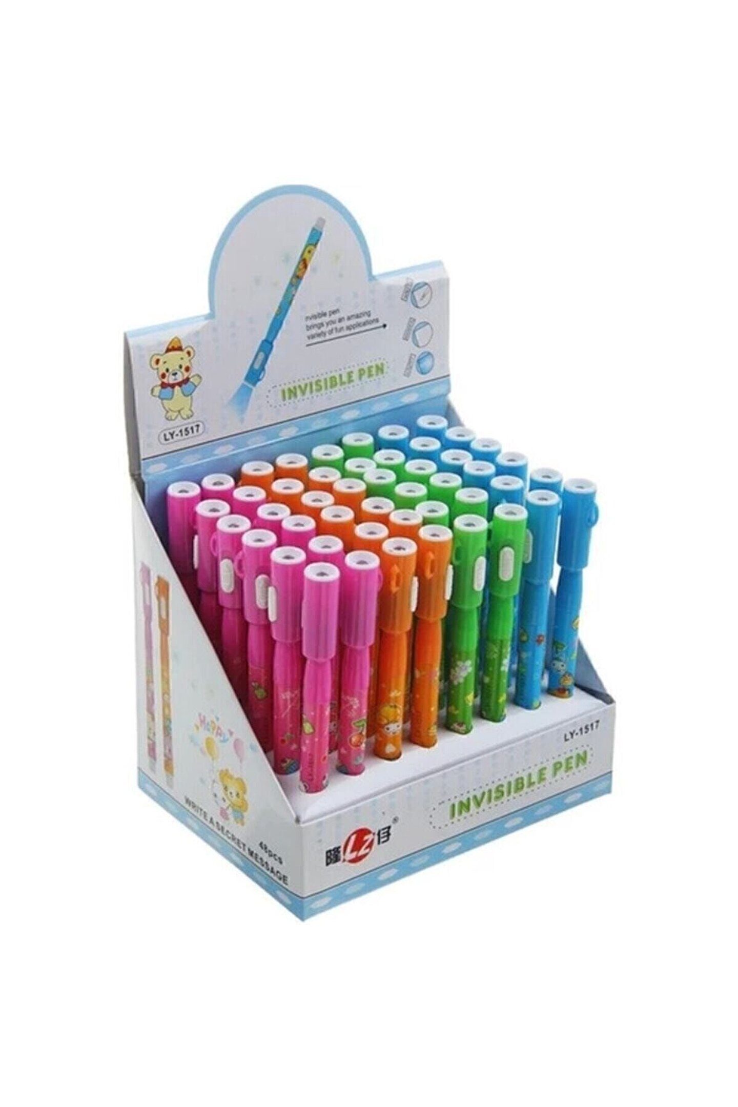 Ayıcık Desenli Işıklı Görünmez Kalem 4 Farklı Renk Gönderilecektir. ; Kalem kullanımı: Görünmez Kalem ile yazdıklarınız normal ışıkta görünmez. ; Sadece Görünmez Kalem'in kapağında yer alan mini UV ışık altında görünür olur. ; Kullanım alanları ise yaratıcılığınıza bağlı olarak sınırsız! Görünmez Kalem ile gizli mesajlar yazabilirsiniz. ; Kağıt, duvar, insan teni, cam, ayna ve ahşap yüzeyler gibi birçok düz zemine istediğinizi gibi yazıp çizebilirsiniz. ; Görünmez Kalem'in mürekkebi birkaç saniye içinde kurur. ; Daha sonra gizli planlarınızı uygulamaya koyulabilirsiniz. ; Ancak ve ancak Görünmez Kalem’in arkasındaki mor ışığı yazıp çizdiğiniz yere doğru tuttuğunuzda gizli mesajlarınız net bir şekilde görünür hale gelir.;