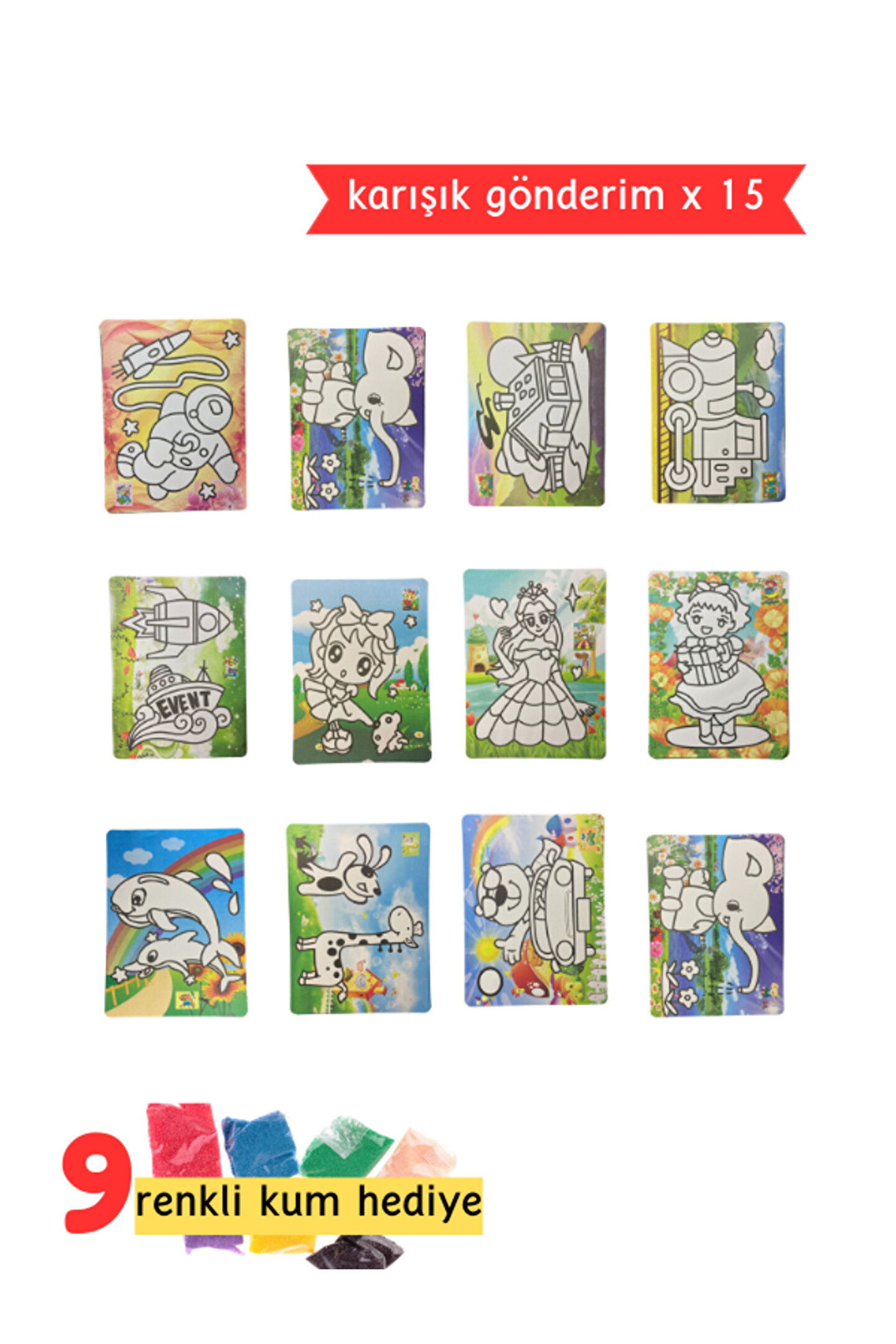 Çocukların hayal gücünü geliştiren ve el becerilerini artıran eğlenceli ve eğitici bir aktivite sunar.; Her biri farklı desen ve renkte olan 15 adet kum boyama sayfasıyla çocukların yaratıcılıklarını özgürce sergilemelerine olanak tanır.; Tekil ürün olarak sunulan bu kum boyama kitabı, çocukların tek başına veya arkadaşlarıyla birlikte keyifle vakit geçirmelerine olanak tanır.; Kum boyama, çocukların motor becerilerini geliştirirken aynı zamanda el-göz koordinasyonunu da destekler.; Çocukların hayal gücünü harekete geçiren renkli ve canlı tasarımları ile her sayfa çocukların ilgisini çeker.; Kolayca yıkanabilen sayfaları sayesinde temizliği pratiktir ve tekrar kullanılabilir özelliğiyle doğa dostudur.; Çocuklara çevre bilinci aşılamak için geri dönüştürülebilir malzemelerden üretilmiştir.; Hafif yapısı sayesinde taşıması kolaydır ve seyahatlerde de kullanılabilir.; Ebeveynlerin güvenle tercih edebileceği kaliteli ve eğitici bir aktivite seçeneğidir.;