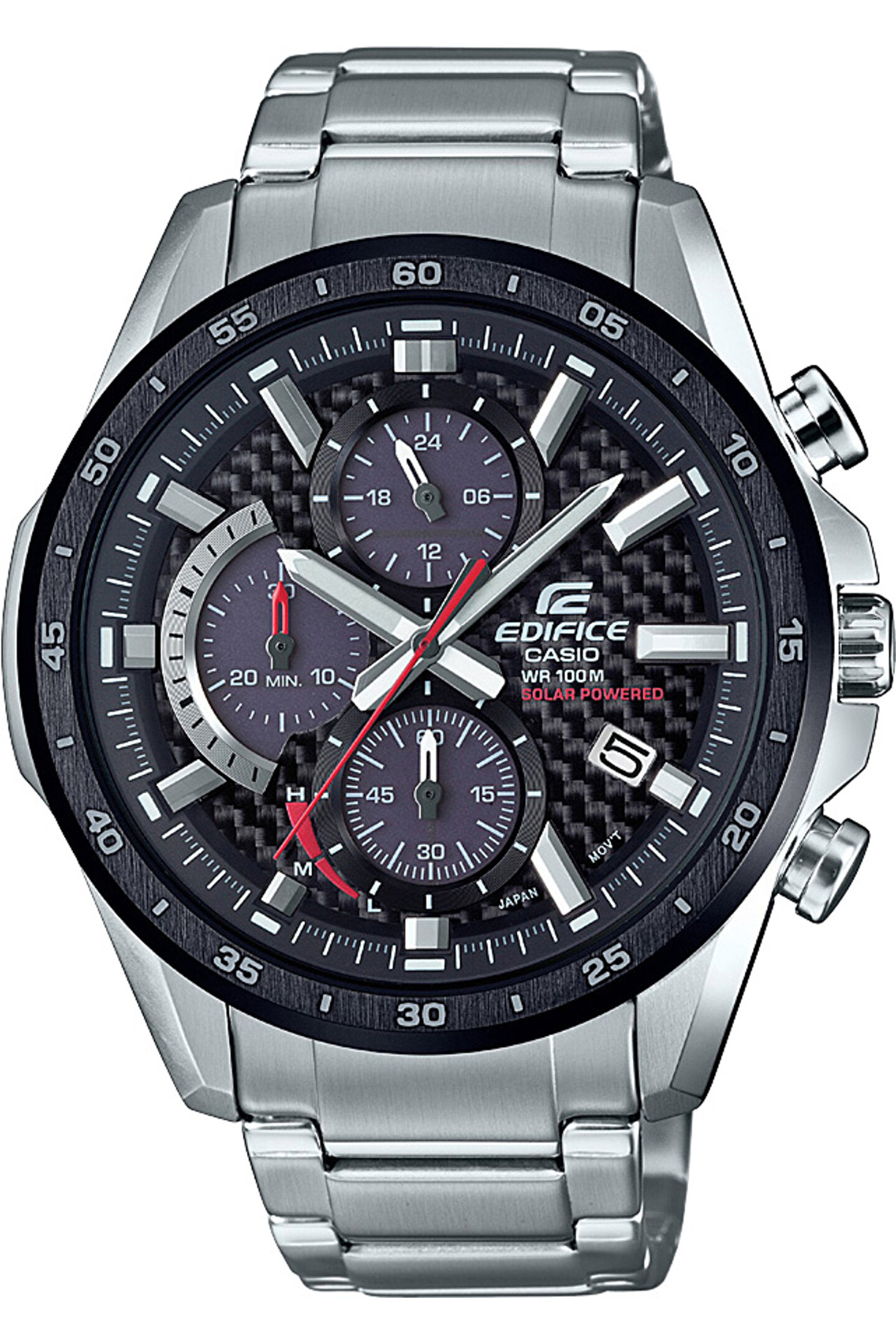 Teknik Özellikler Gövde / çerçeve malzemesi: Paslanmaz çelik Tek basışta açılan, 3 katlı Toka Paslanmaz Çelik Kordon Mineral Cam Kilit Vidalı Arka Kapak 100 metreye kadar su geçirmez Güneş enerjili 1 saniye hassasiyetli kronometre Ölçüm kapasitesi: 29'59 Ölçüm modları: Geçen süre, 1. ve 2. gelenlerin süreleri Pil seviyesi göstergesi Tarih ekranı Normal saat işlemleri Analog: 3 kol (saat, dakika, saniye) 3 kadran (24 saat, kronometre dakikası, kronometre saniyesi) Hassasiyet: ±20 saniye/ay Tam şarjlı durumdan kollar duruncaya kadar çalışma süresi: Yaklaşık 5 ay Gövde boyutu : 51,5×47,6×12mm Toplam ağırlık : 156g