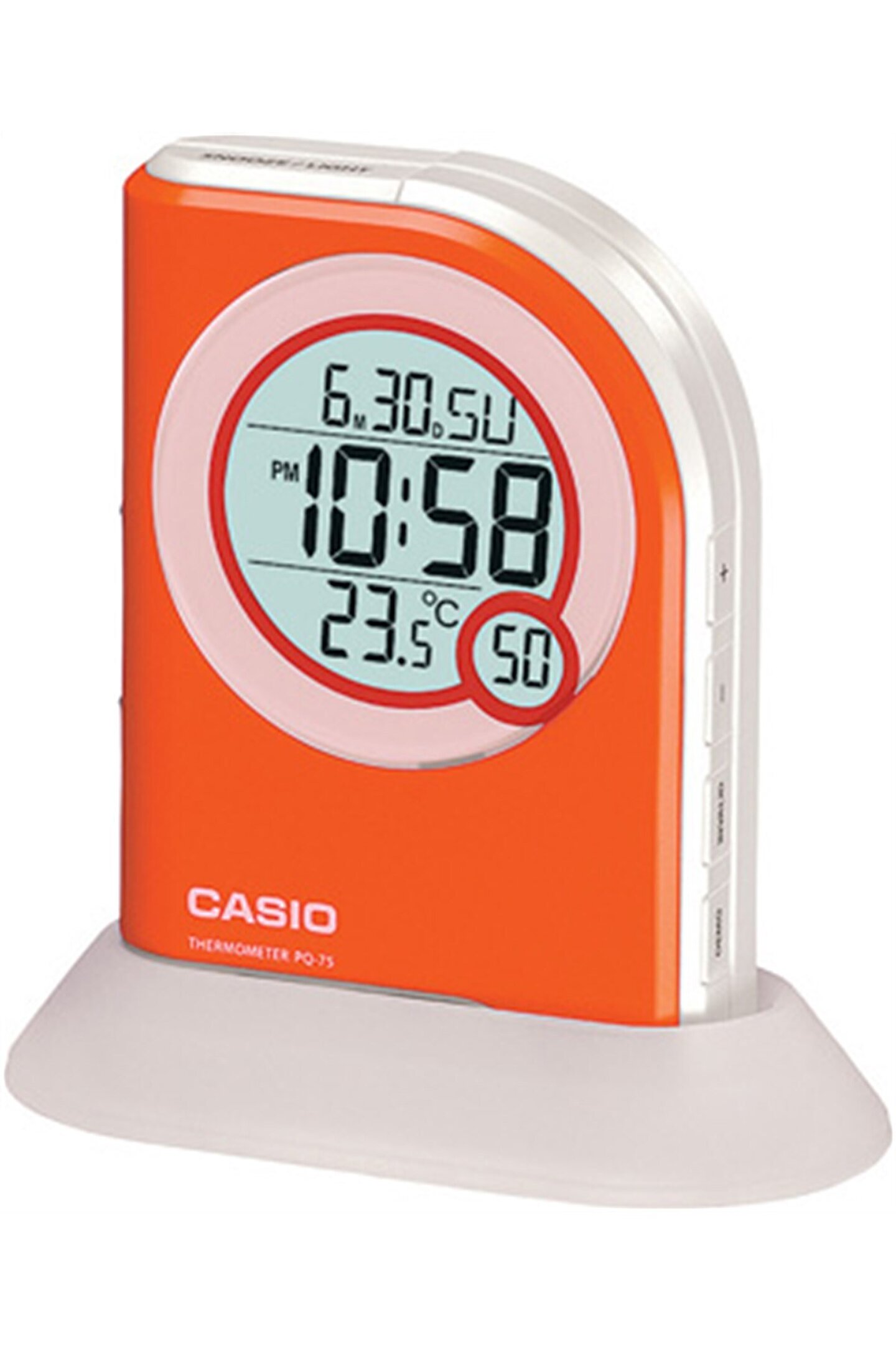 Genel Özellikler Marka Casio Seri Clock Cinsiyet Masa Makine Tipi Digital Garanti 2 Yıl Ağırlık 155 gr Su Geçirmezlik 0 m Kasa & Kayış & Kadran Kasa Çapı 71 mm Kasa Yüksekligi 103 mm Kasa Kalınlığı 24 mm Kasa RengiBeyaz-Turuncu Kasa Şekli Köşeli Kasa Cinsi Plastik Kayış Rengi Turuncu Kadran Rengi Gri Kasa-Kadran Taşı- Özellikler Alarm Var Aydınlatma Var Takvim Var Termometre Var