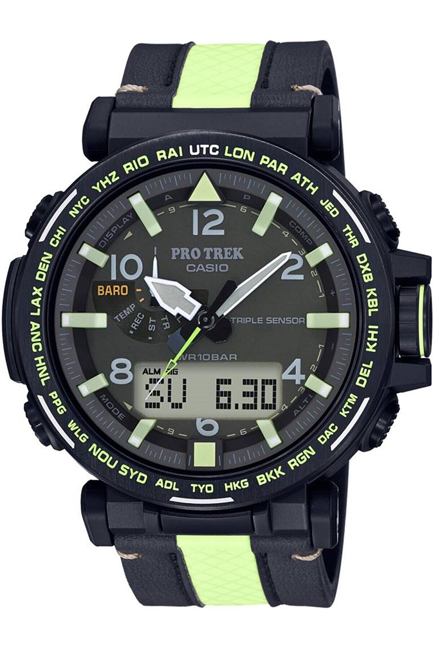 Temel Özellikler; Alarm, Altimetre, Aydınlatma, Barometre, Dünya Saatleri, Güneş Enerisi, Kronometre, Pusula, Rakım Ölçümü, Takvim, Termometre Genel Özellikler; Tarz : Outdoor Saat Seri : Pro Trek Kasa Şekli : Oval Kasa Cinsi : Plastik Kasa Rengi : Siyah Kadran Rengi : Siyah Kordon Rengi : Siyah-Yeşil Kordon Tipi : Deri Cam Tipi : Mineral Su Geçirmezlik : 100 Atm Ağırlık : 74 Gr Ölçü : 51.5x51.6x13.4 Makine Tipi : Analog / Digital Menşei : Tayland Diğer Özellikler; 12/24 Saat Formatı, Pil Seviye Göstergesi, Sessizlik Fonksiyonu, Vidalı Kurma Kolu, Düşük Derece Dayanıklığı, Otomatik Yerel Saat Kalibrasyonu