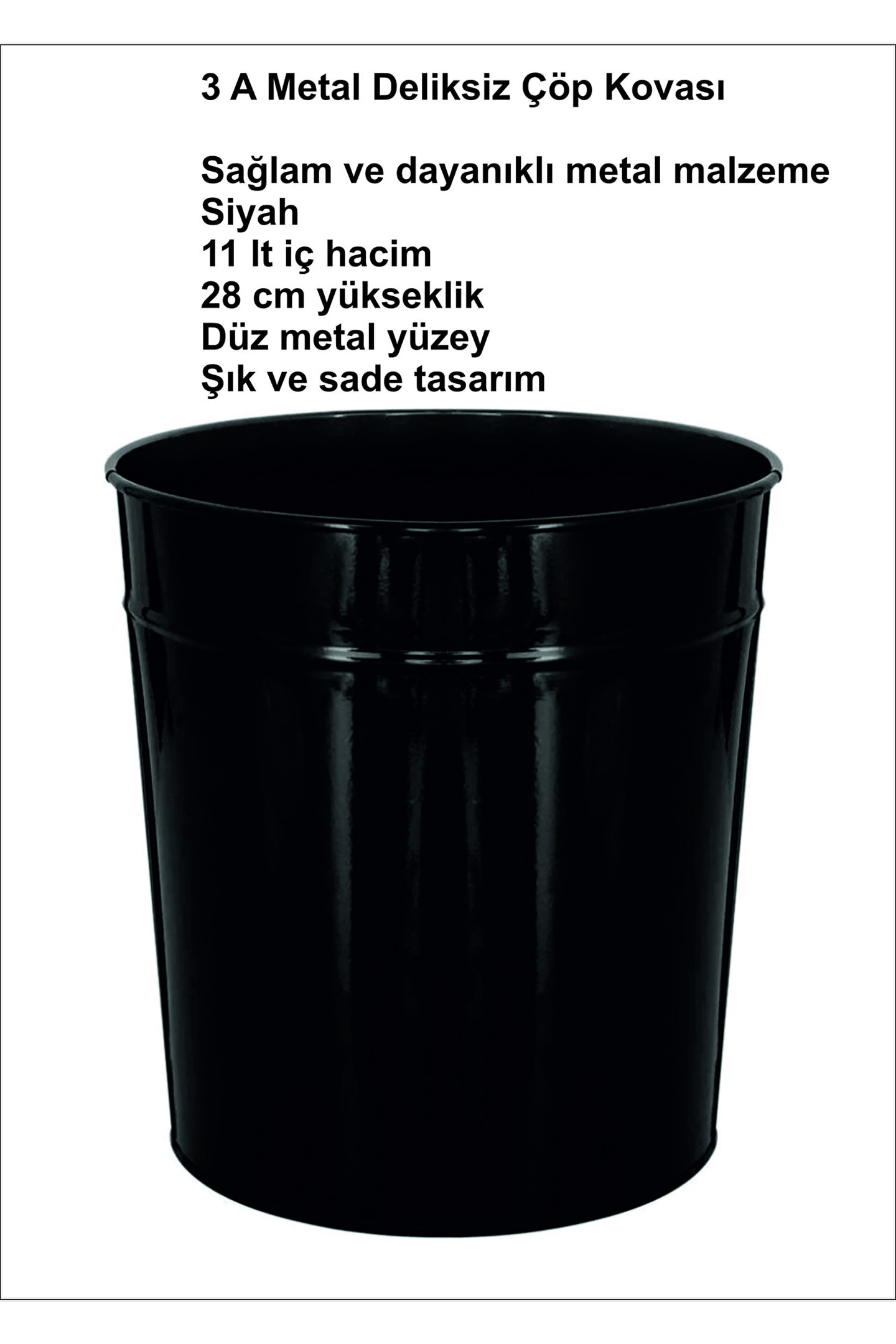 CASSA Metal Deliksiz Çöp Kovası Sağlam ve dayanıklı metal malzeme Siyah 11 lt iç hacim 28 cm yükseklik Düz metal yüzey Şık ve sade tasarım