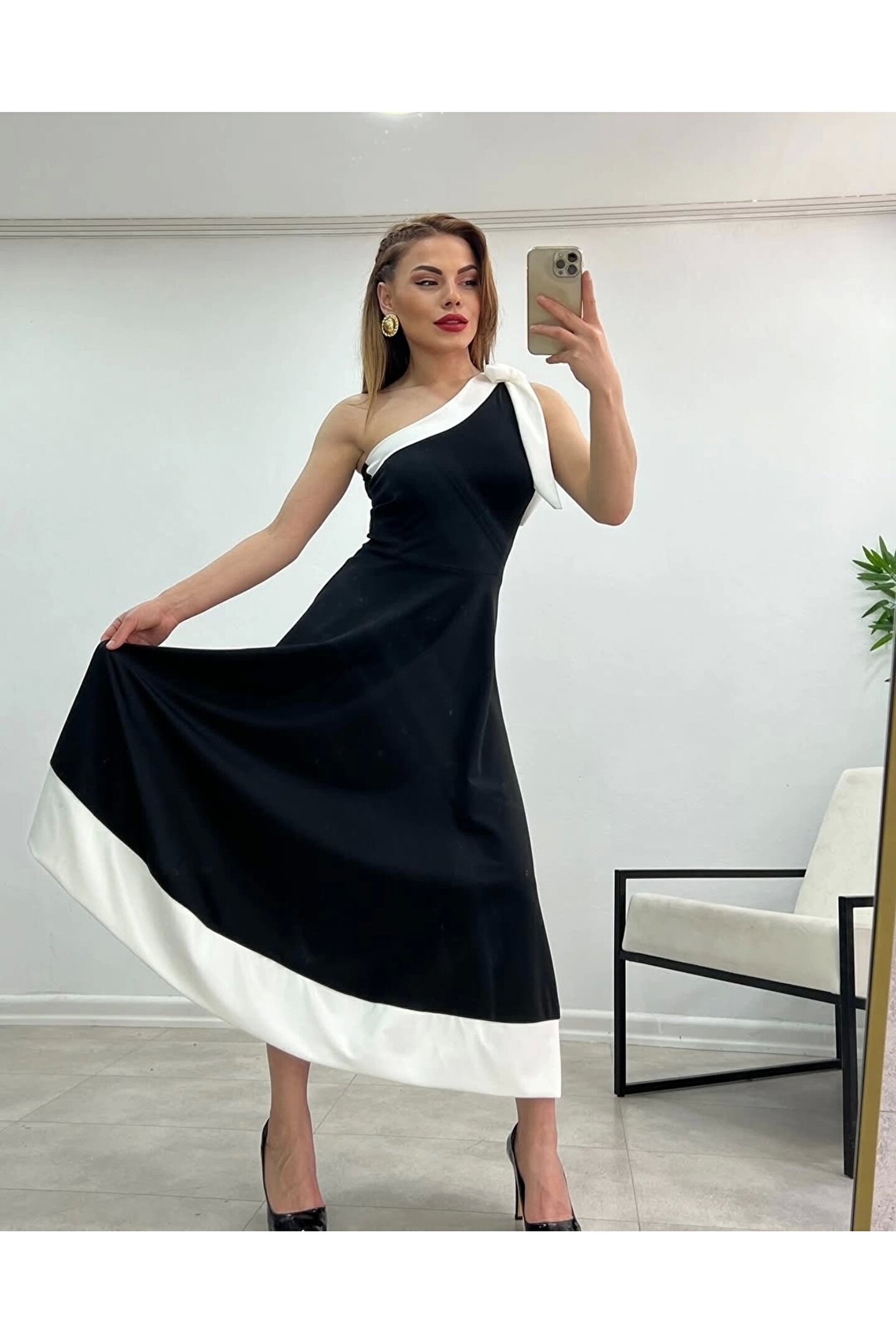 Kadın Tek Omuzu Açık Omuzlardan Kurdela Detaylı çift Renkli Ithal Krep Elbise