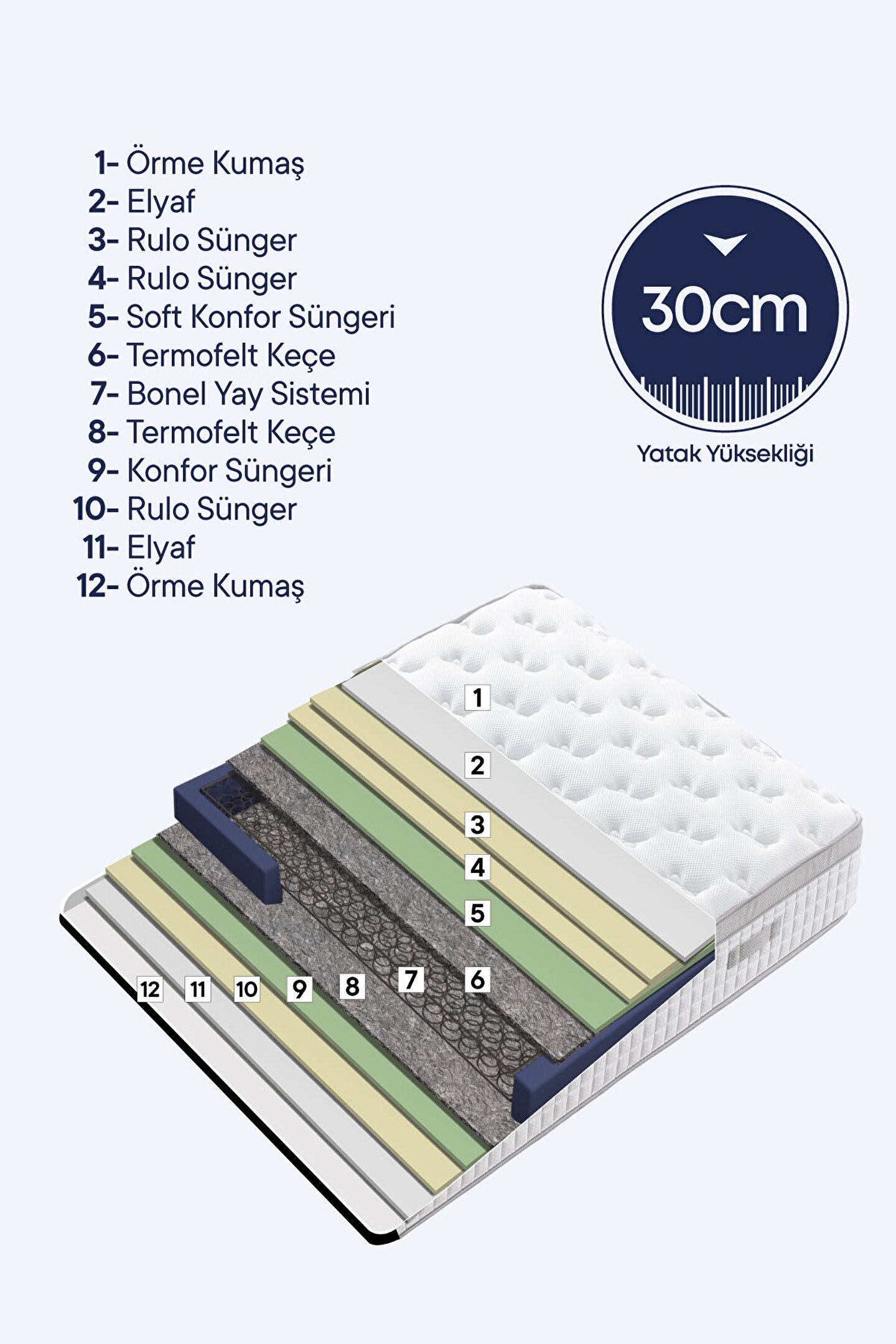 Yay Tipi – Pocket Yay Sistemi Yay: Bonel Yay Destek: Omurga dostu ve hareket izolasyonlu yapı Konfor Katmanları Sünger: Yüksek yoğunluklu destek süngeri ve konfor süngeri Ekstra: Isı dengeleyici elyaf ve thermofelt keçe Kenar: Çevre destek süngeri ile form koruma Kumaş Türü Kumaş: Örme kumaş, nefes alabilir ve Yatak Yüksekliği Toplam Yükseklik: Yaklaşık 30 cm Ekstra Özellikler Kullanım: Tek taraflı Paketleme: Roll Pack ambalaj, açıldıktan sonra 48-72 saatte form alır Nakliye bina önü değil, kapı teslimidir.