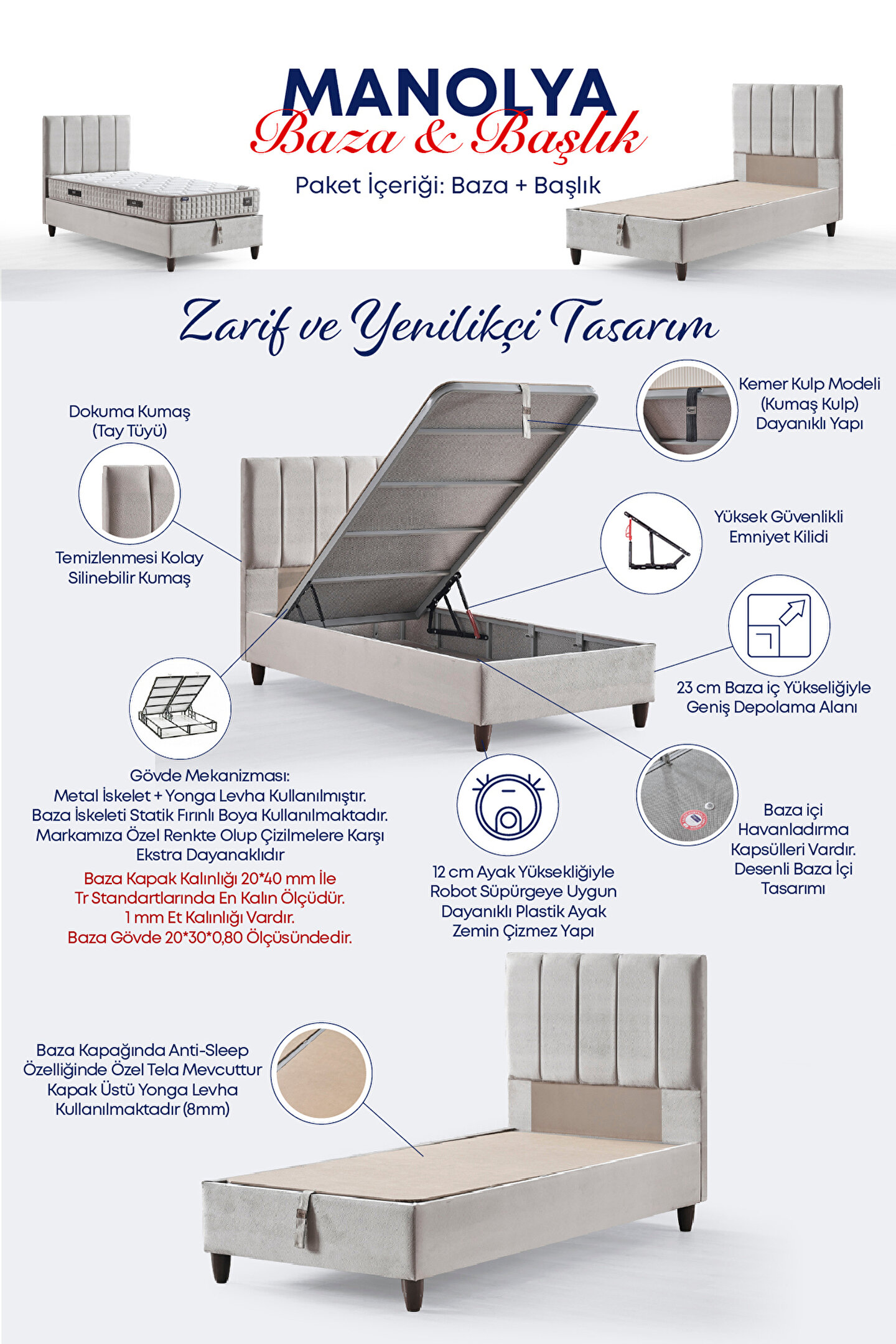 Tek Kişilik Manolya Başlık & Baza Takımı & Yatak 3 lü Set Manolya Başlık Özellikleri Kumaş ve Konfor Kumaş Türü: Dokuma kumaş Özellik: Sünger dolgulu ve kolay silinebilir yapı Ölçüler Yükseklik (Boy): 101 cm Derinlik: 7 cm Manolya Baza Özellikleri Kumaş ve Malzeme Kumaş Türü: Dokuma kumaş Çevresi: Sünger dolgulu, kolay silinebilir yüzey Kapak Kalınlığı: 20x40 mm (TR standartlarında en kalın ölçü) Kapak Üstü : Kaydırmaz Tela Kullanılmıştır Et Kalınlığı: 1 mm Gövde Ölçüsü: 20x30x0.80 mm İskelet: Statik fırınlı boya, çizilmeye karşı ekstra dayanıklı ve markaya özel renkte Teknik Detaylar Baza Tipi: Sandıklı baza Depolama Alanı: 23 cm iç yükseklik Kulp Tipi: Kemer model kumaş kulp Ayak Yüksekliği: 12 cm (robot süpürge uyumlu) Gövde Mekanizması: Metal iskelet + yonga levha Güvenlik ve Dayanıklılık Emniyet: Yüksek güvenlikli emniyet kilidi Kapakta: Anti-Sleep özellikli özel tela Garanti: 2 yıl Manolya Yatak Özellikleri Yay Sistemi – Sessiz Paket Yay Yay: Sessiz paket yay (torba yay) sistemi, konforlu bir uyku deneyimi sunar.; Uyum: Vücut hatlarını takip eden yapı, gece boyunca doğal duruşu destekler.; Destek Katmanları Sünger: 24 DNS destek süngeri, ideal sertlik ve konfor dengesini sağlar.; Sertlik Derecesi : Orta sert Konfor : Full-ortopediktir bu sayede bel ağrılarını minumuma indirir.; Omurga sağlığını destekler Kaplama ve Kumaş Kumaş: Ferahlatıcı etkili, terlemeyi önleyici doğal örme kumaş Yatak Yüksekliği Yükseklik: 22 cm standart ölçü Ekstra Özellikler Kullanım: Çift yönlü destek katmanı, özel hava kanalları sayesinde serin uyku deneyimi Hijyen: kolay temizlenebilir Bilgilendirme : Doktorların tavsiye ettiği yatak modeli Paketleme : Roll Pack şeklinde gönderilmektedir.; Yatağın tam formuna gelmesi 48 - 72 saat arasındadır Nakliye bina önü değil, kapı teslimidir.