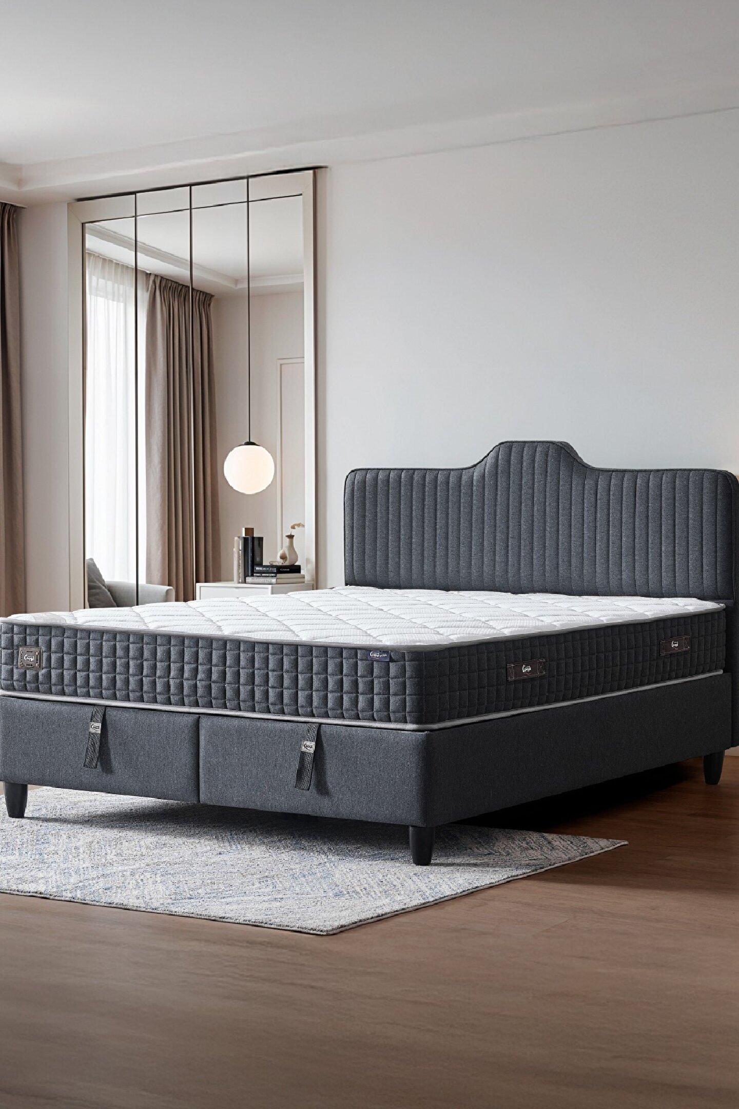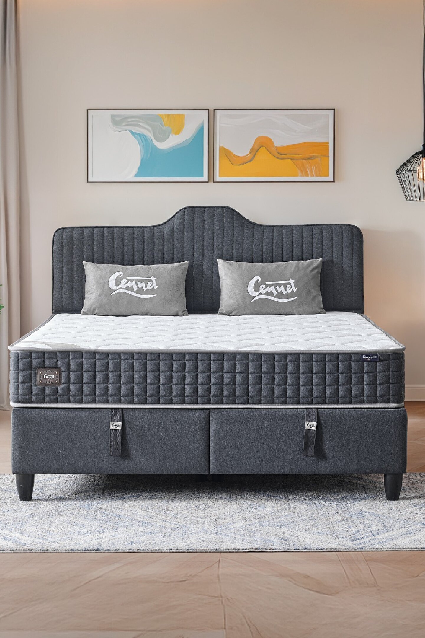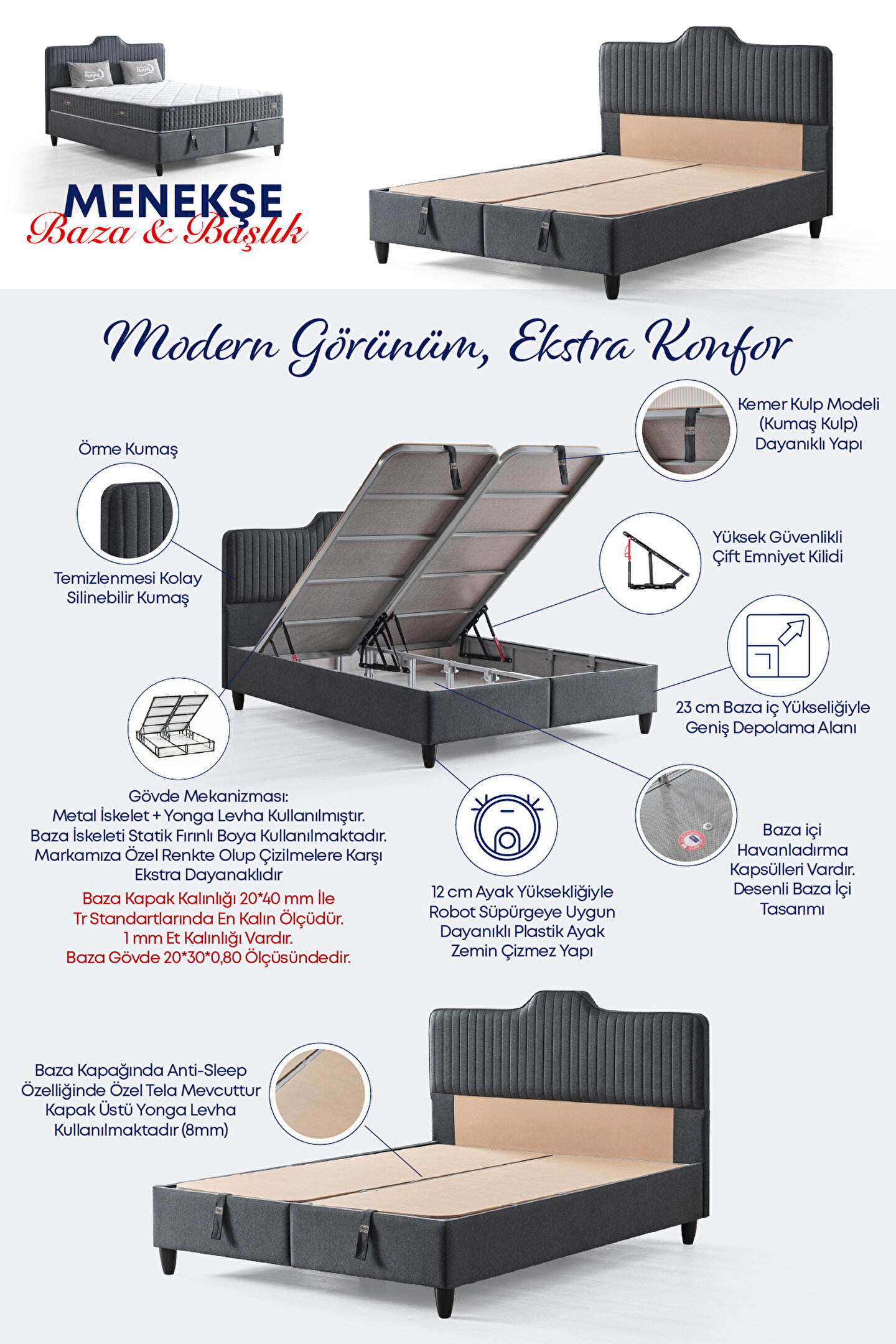 Çift Kişilik Menekşe Başlık & Baza Takımı & Yatak 3 lü Set Menekşe Başlık Özellikleri Kumaş ve Konfor Kumaş Türü: Keten kumaş Özellik: Sünger dolgulu ve kolay silinebilir yapı Ölçüler Yükseklik (Boy): 101 cm Derinlik: 7 cm Menekşe Baza Özellikleri Kumaş ve Malzeme Kumaş Türü: Nefes alabilen keten kumaş Çevresi: Sünger dolgulu, kolay silinebilir yüzey Kapak Kalınlığı: 20x40 mm (TR standartlarında en kalın ölçü) Kapak Üstü : Kaydırmaz Tela Kullanılmıştır Et Kalınlığı: 1 mm Gövde Ölçüsü: 20x30x0.80 mm İskelet: Statik fırınlı boya, çizilmeye karşı ekstra dayanıklı ve markaya özel renkte Teknik Detaylar Baza Tipi: Sandıklı baza Depolama Alanı: 23 cm iç yükseklik Kulp Tipi: Kemer model kumaş kulp Ayak Yüksekliği: 12 cm (robot süpürge uyumlu) Gövde Mekanizması: Metal iskelet + yonga levha Güvenlik ve Dayanıklılık Emniyet: Yüksek güvenlikli emniyet kilidi Kapakta: Anti-Sleep özellikli özel tela Garanti: 2 yıl Menekşe Yatak Özellikleri Yay Teknolojisi Yay Tipi: Omurga destekli akıllı yay sistemi Avantaj: Sessiz çalışma ve kişisel konfor alanı sunar Destek Katmanı Sünger: 24 DNS yüksek yoğunluklu destek süngeri Sertlik: Orta sert Kumaş ve Kaplama Kaplama: Hava dolaşımını artıran antibakteriyel örme kumaş Yatak Kalınlığı Yükseklik: 25 cm ergonomik yükseklik Ekstra Özellikler Kullanım: Tercihe göre çift taraflı kullanım imkanı Temizlik: Temizlenebilir Dış yüzey ile kolay bakım Paketleme : Roll Pack şeklinde gönderilmektedir.; Yatağın tam formuna gelmesi 48 - 72 saat arasındadır Nakliye bina önü değil, kapı teslimidir.