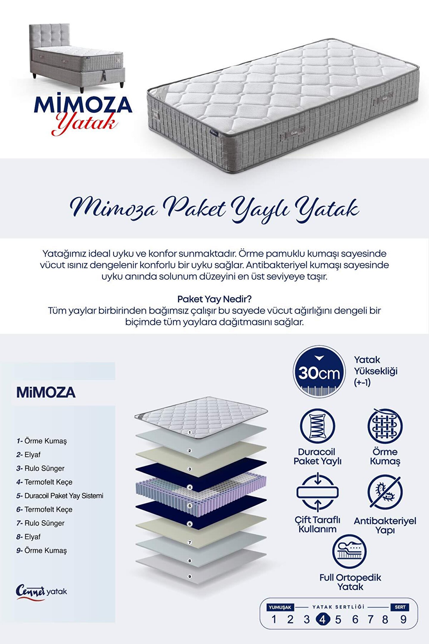 CENNET YATAK Mimoza Modeli Çift Kişilik Paket Yaylı Yatak Full Ortopedik ve Antibakteriyel Özellikli