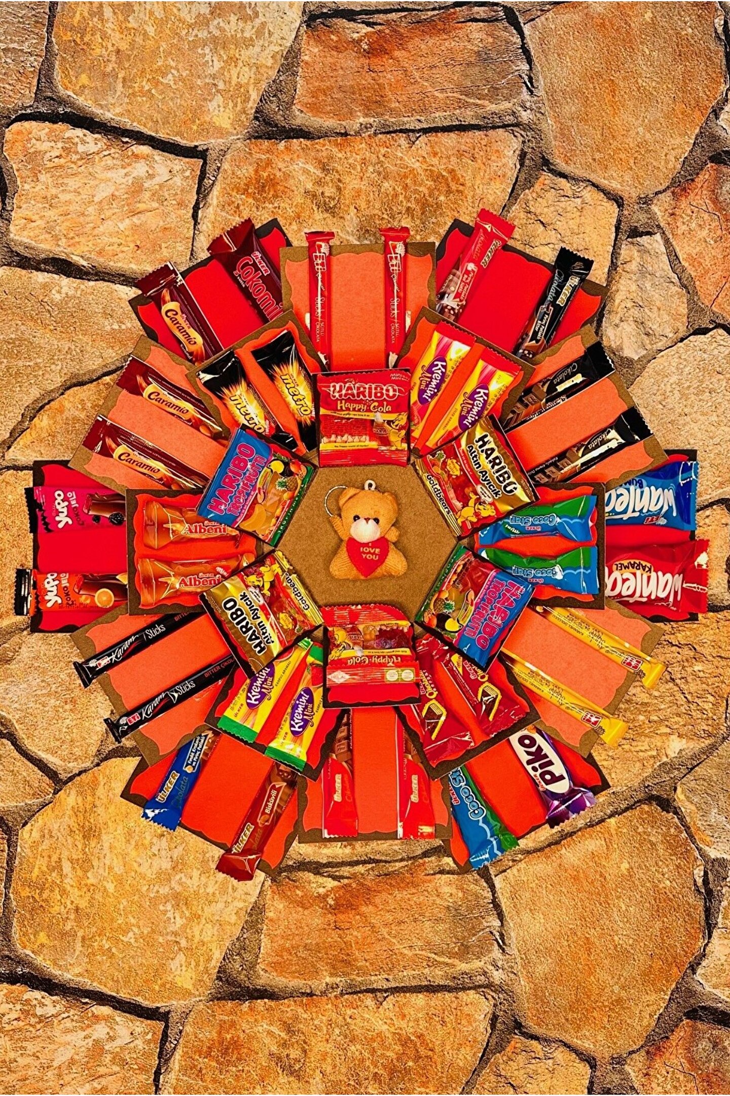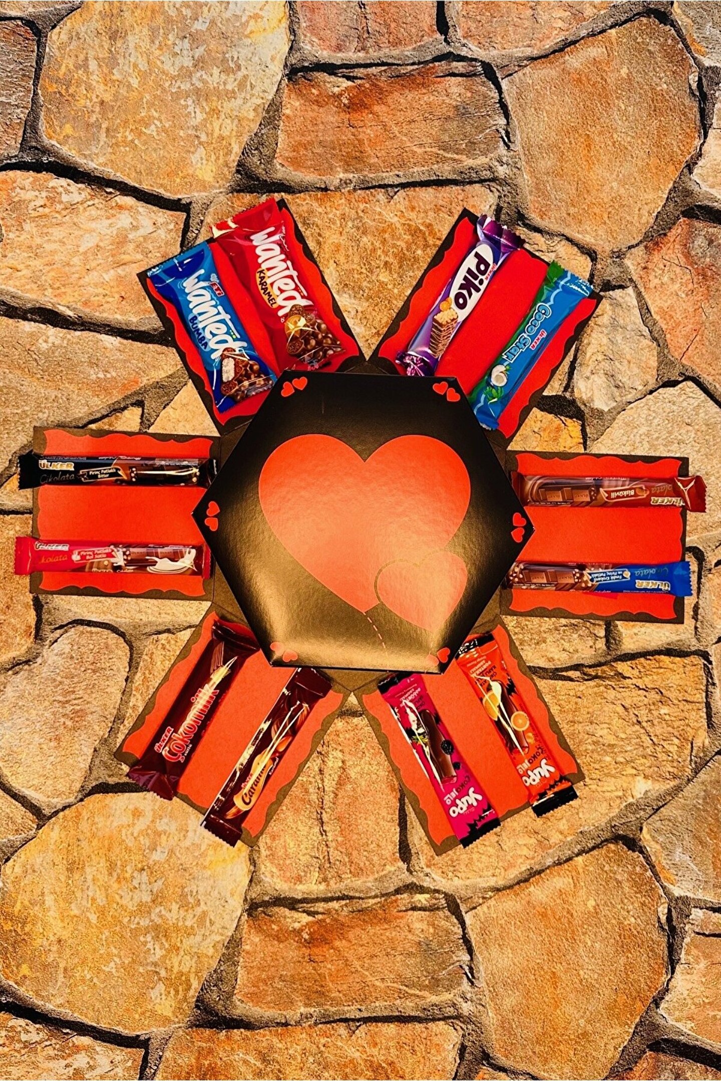 Kutu içerisinde 40 adet çikolata bulunmaktadır; Çikolataların hepsi markalı çikolatalar olup resimde göründüğü gibi gelmektedir; Kutunun kapalı hali 22; 25; 14 cm altıgen şeklindedir; ;;