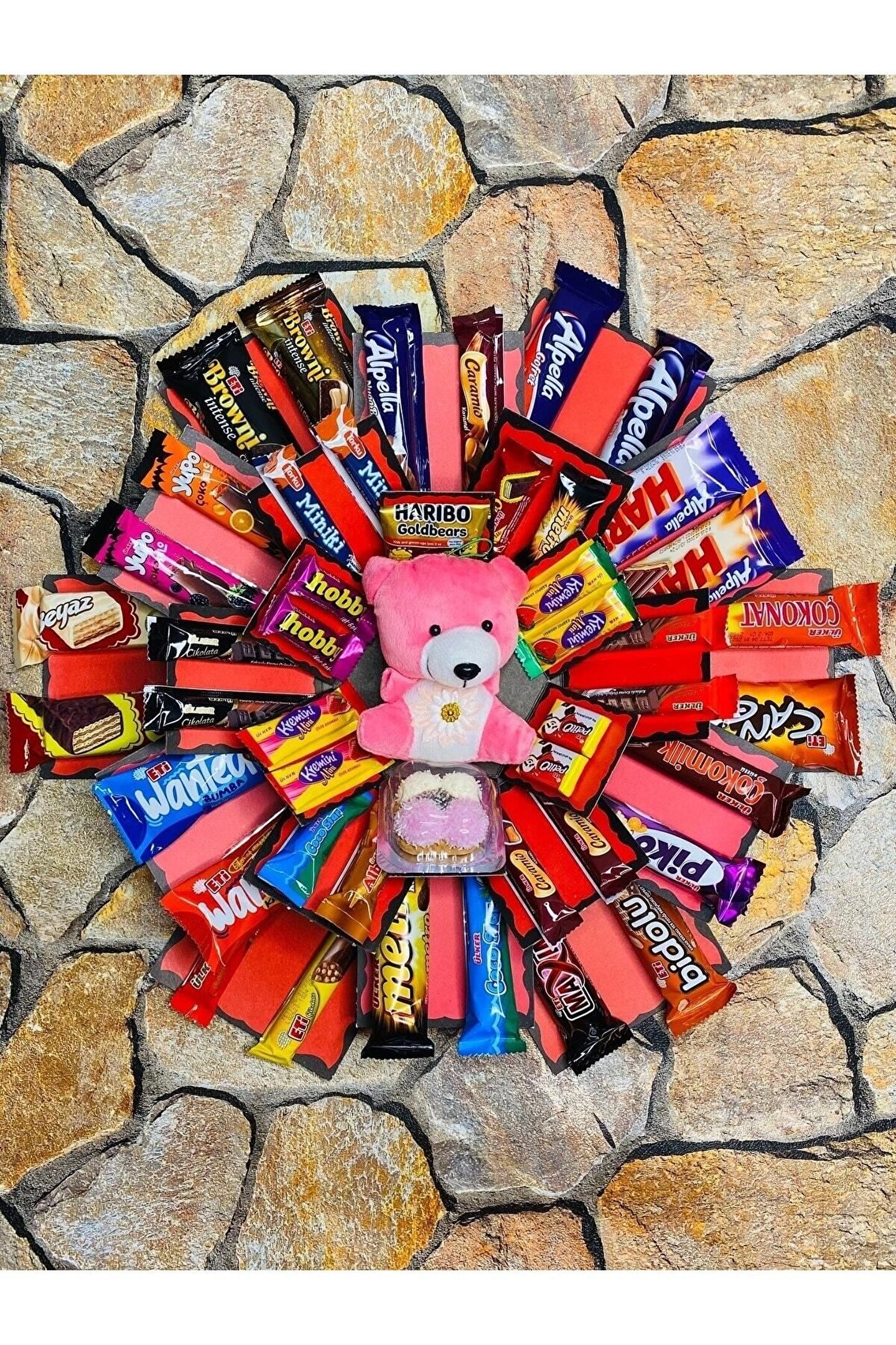 Kutu içerisinde 46 adet çikolata ve ortasında peluş oyuncak hediyemiz bulunmaktadır. ; Çikolataların hepsi markalı çikolatalar olup resimde göründüğü gibi gelmektedir. ; Hediye olarak gönderdiğimiz peluş oyuncak değişiklik gösterebilmektedir. ; Kutunun kapalı hali 22*25*14 cm altıgen şeklindedir.;