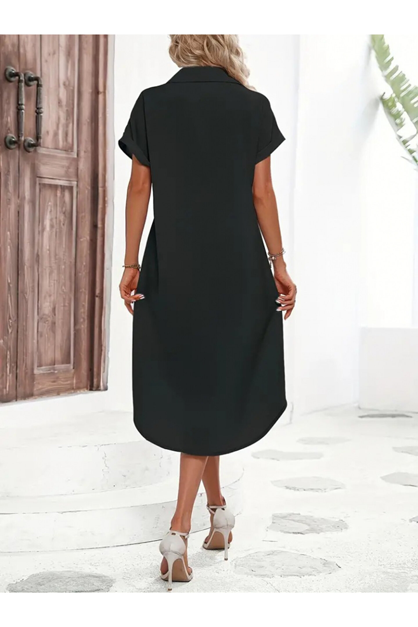 Kadın Kısa Kollu Yakalı Düğme Detay Midi Dokuma Elbise