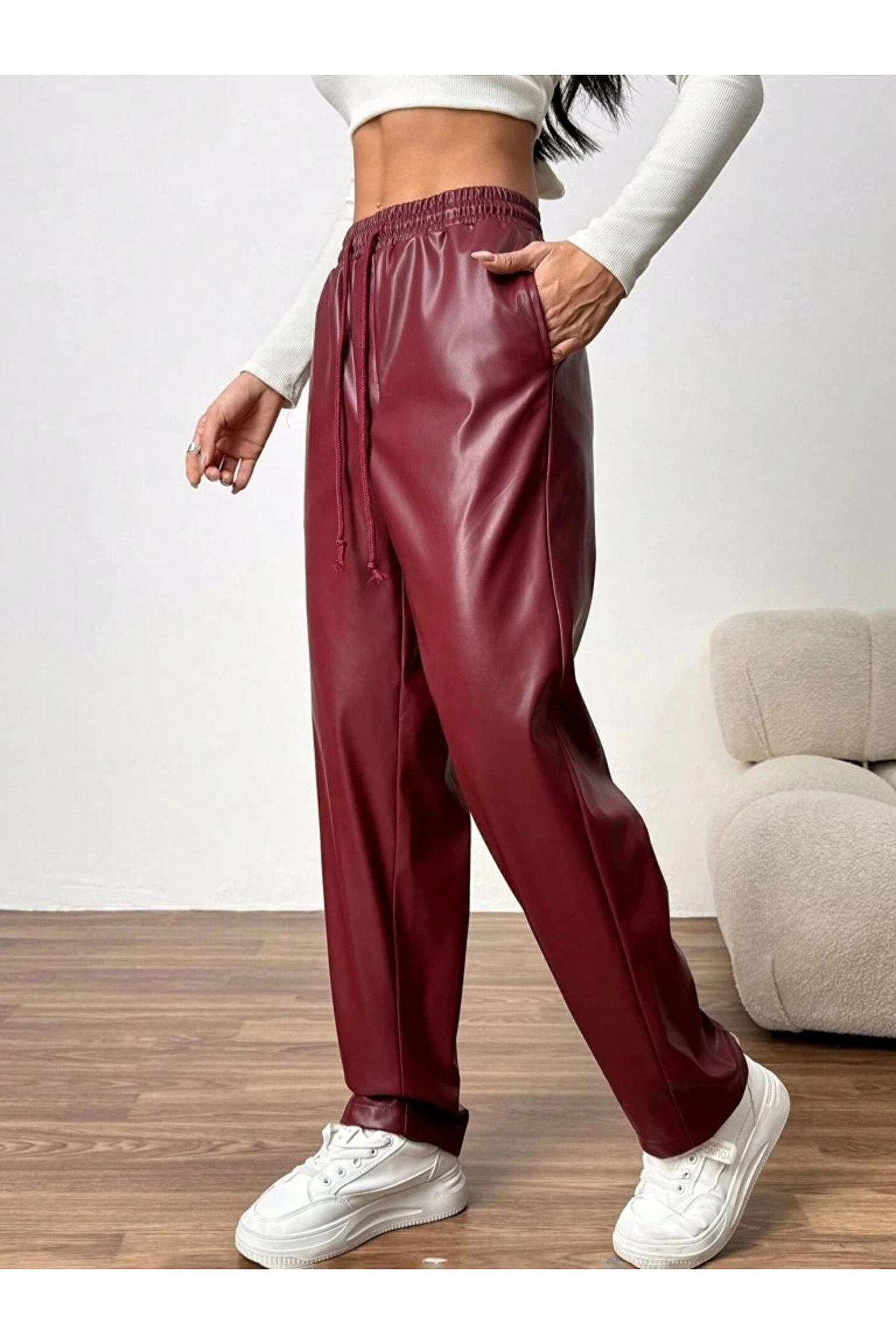 Kadın Yüksel Bel Bağcıklı Deri Pantolon