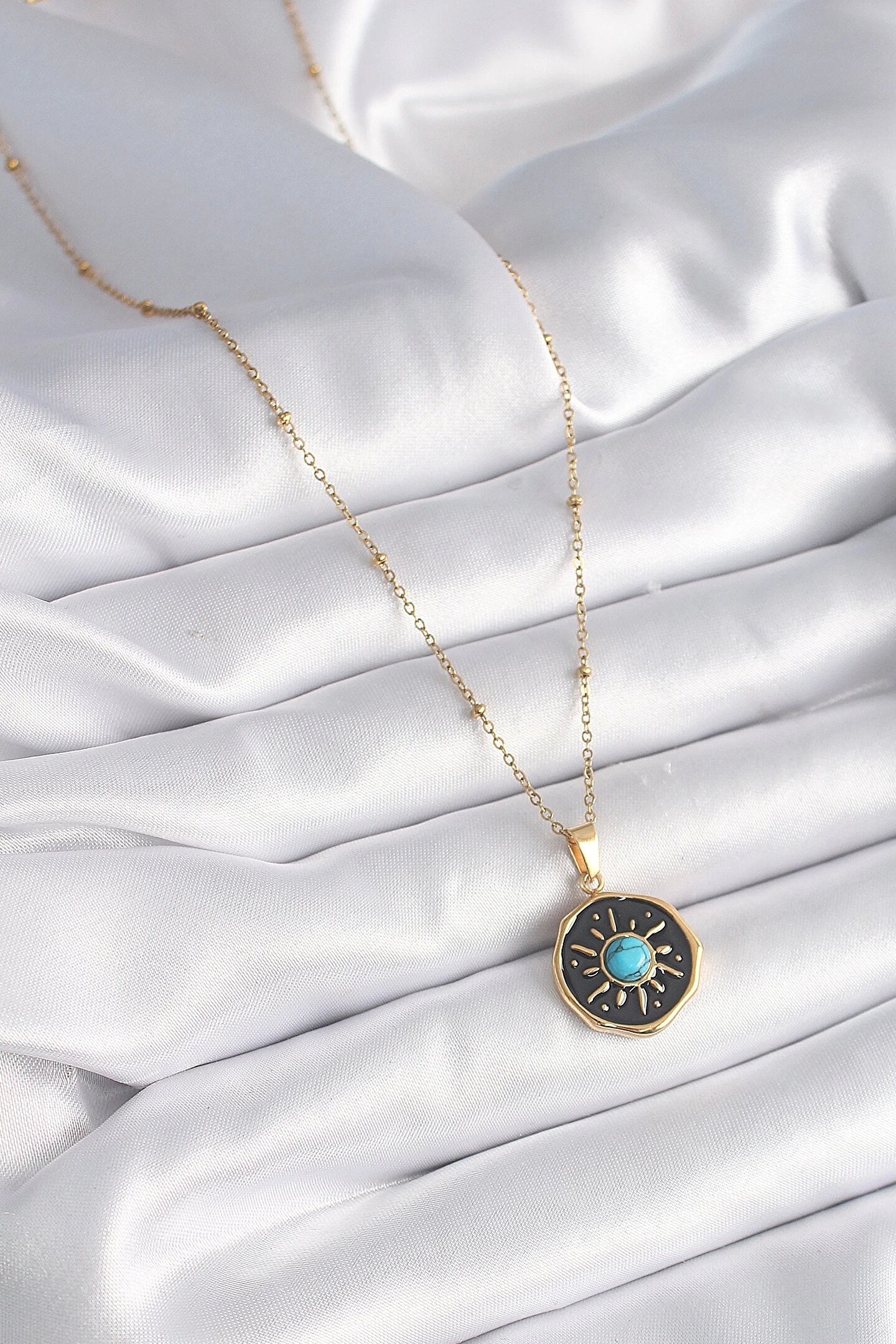 Clariss 316L Çelik Gold Renk Mavi Boncuk Güneş İşleme Madalyon Model Kadın Kolye
