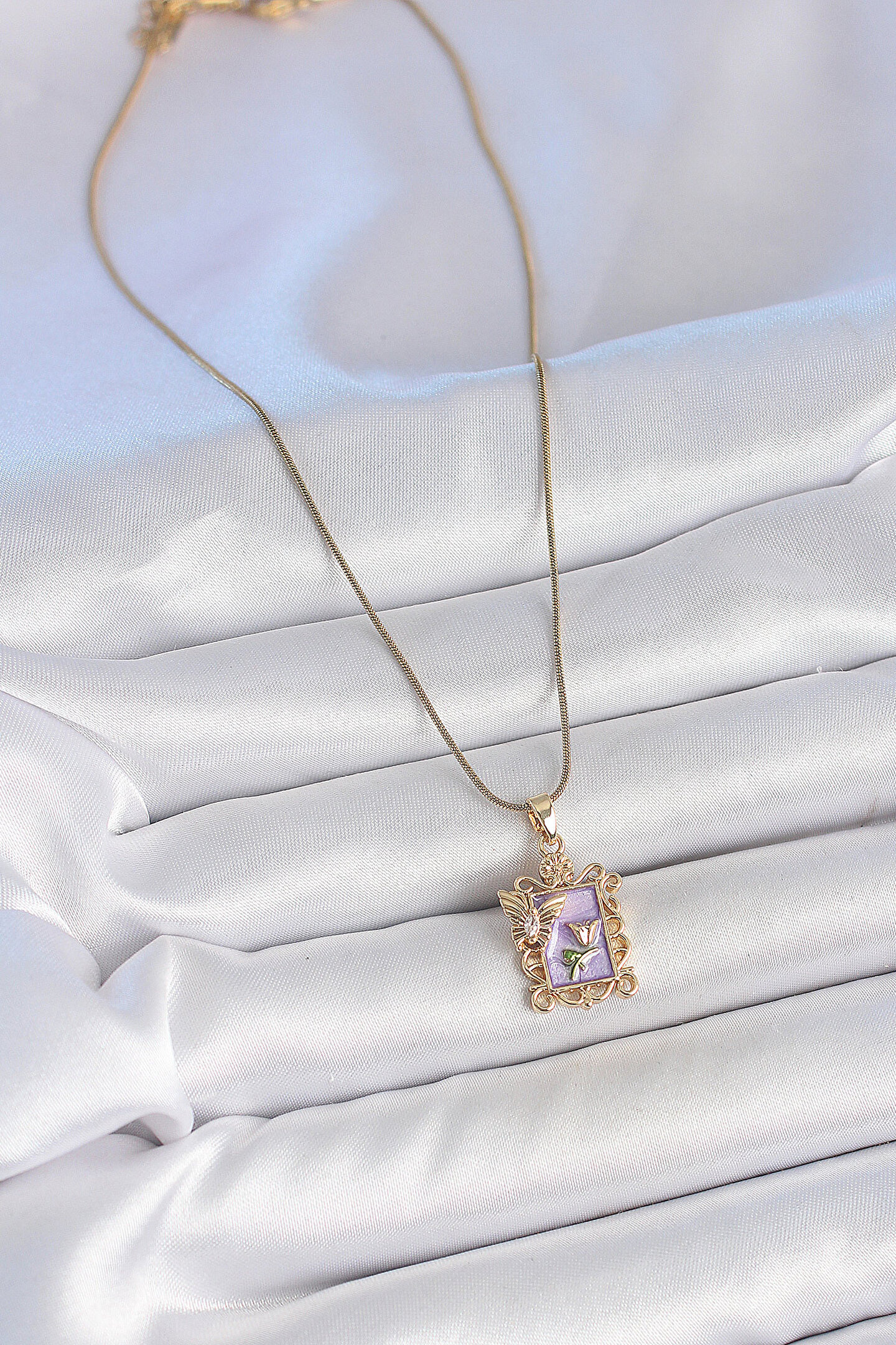 Clariss 316L Çelik Gold Renk Zincir Mor Mineli Çiçek İşlemeli Zirkon Taşlı Kelebek Detay Portre Model Kadın