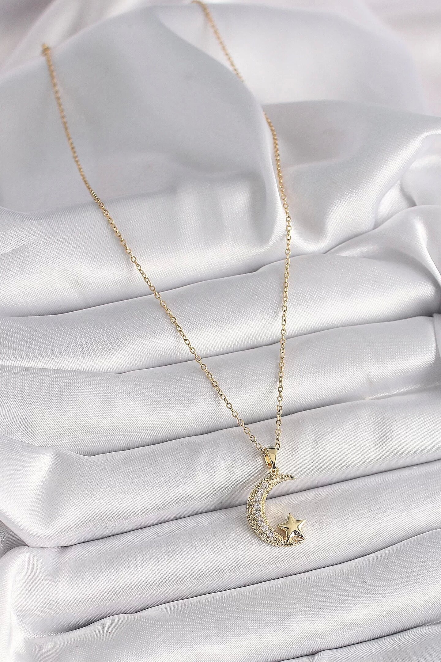 Clariss 316L Çelik Gold Renk Zincir Zirkon Taşlı Hilal Model Yıldız Detay Kadın Kolye