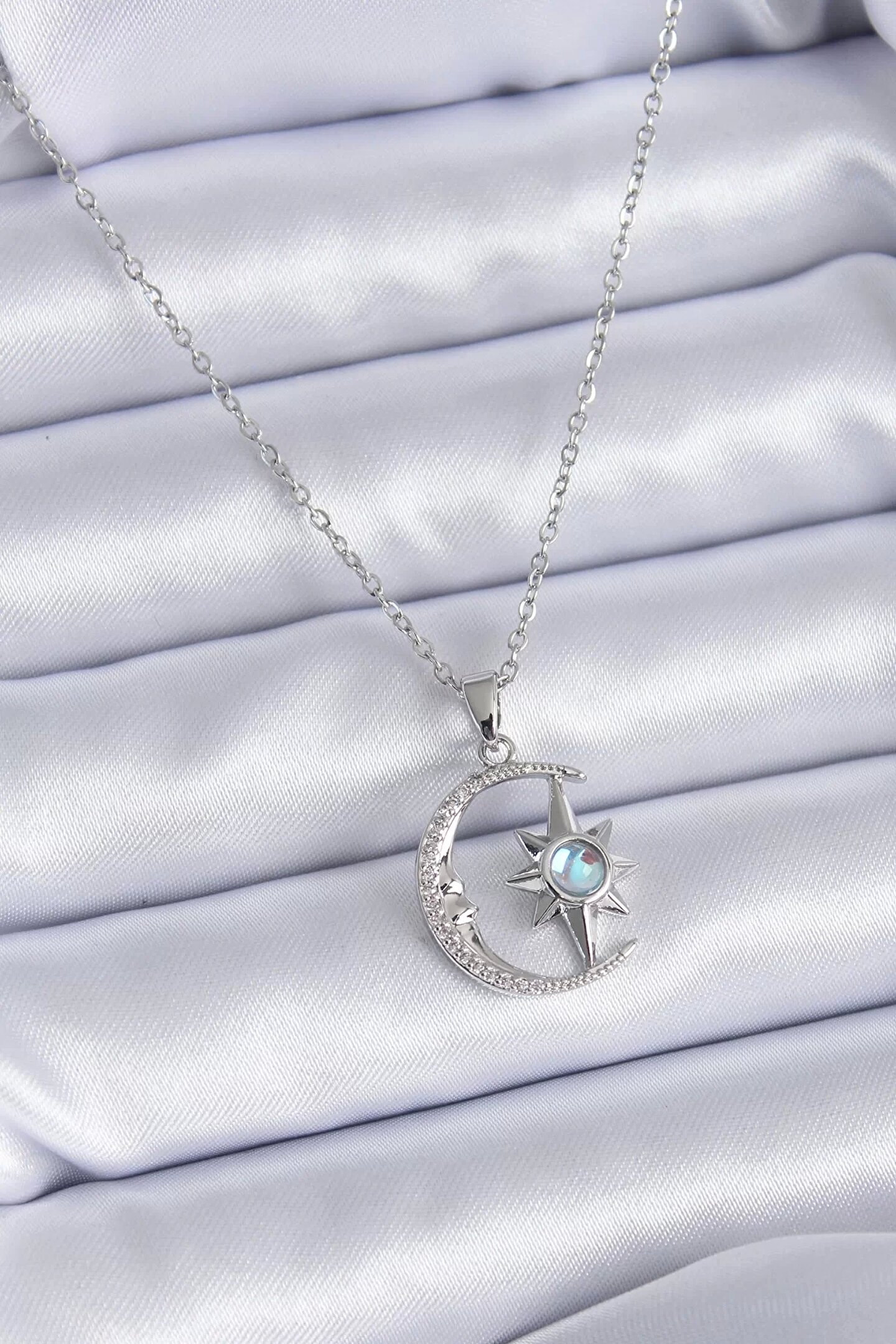 316L Çelik Gümüş Renk Zirkon Taşlı Ay Yıldız Model Kadın Kolye