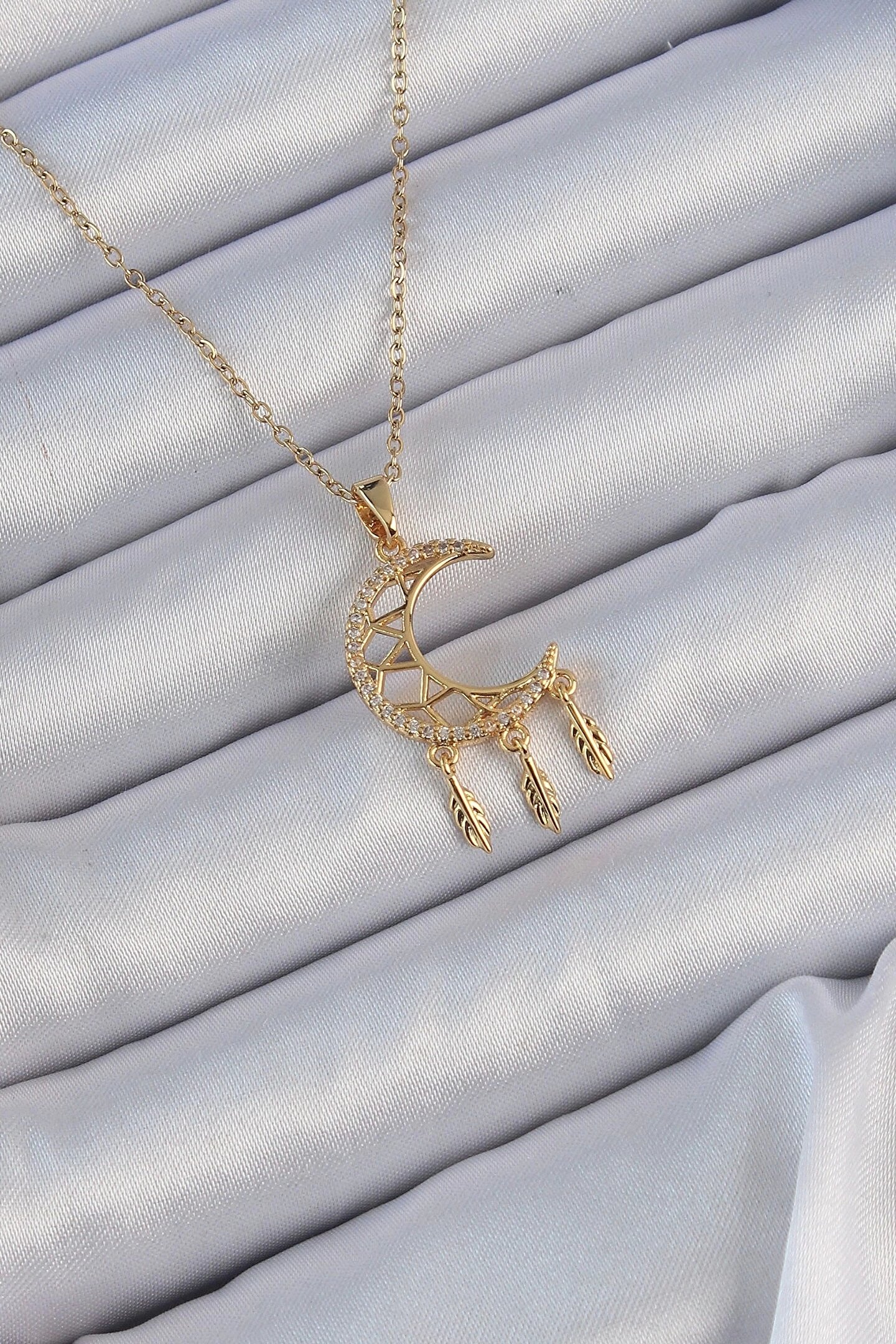 Clariss 316L Çelik Zincir Altın Renk İşlemeli Zirkon Taşlı Ay Kolye
