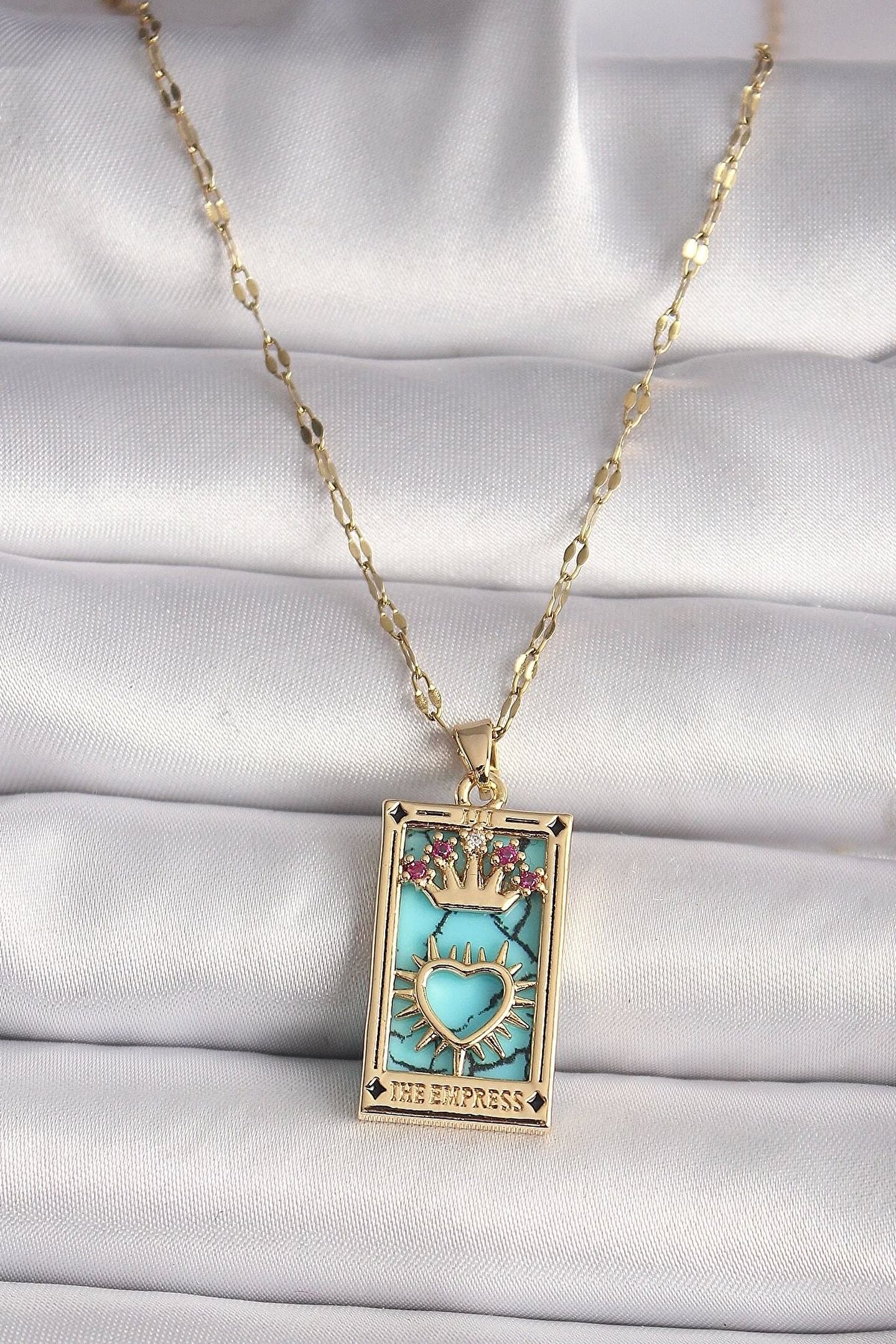 316L Gold Renk Pembe Zirkon Taşlı Taç Kalp Portre Model Kadın Kolye