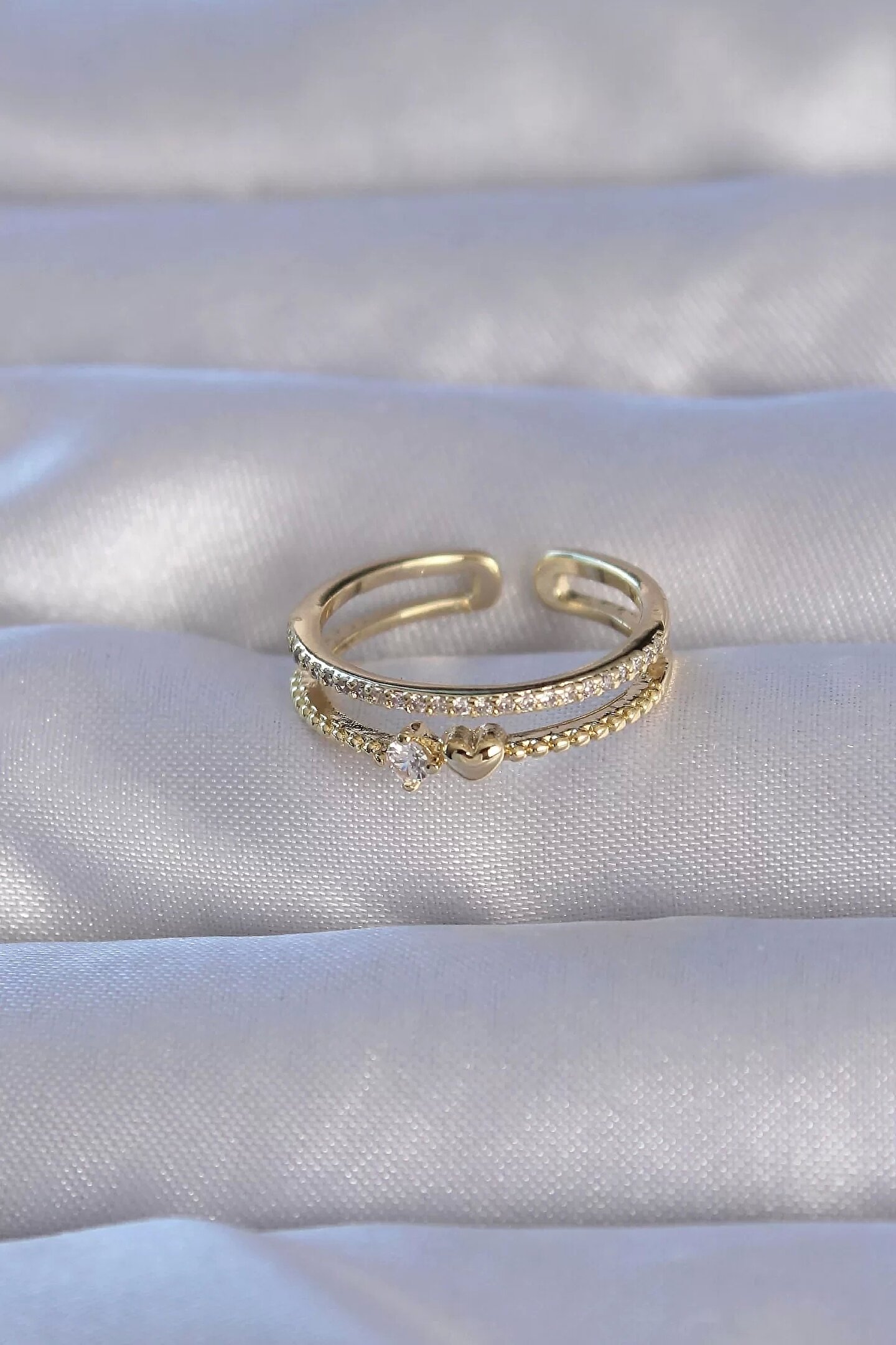 Pirinç Gold Renk Zirkon Taşlı Kalpli Su Yolu Model Ayarlanabilir Yüzük