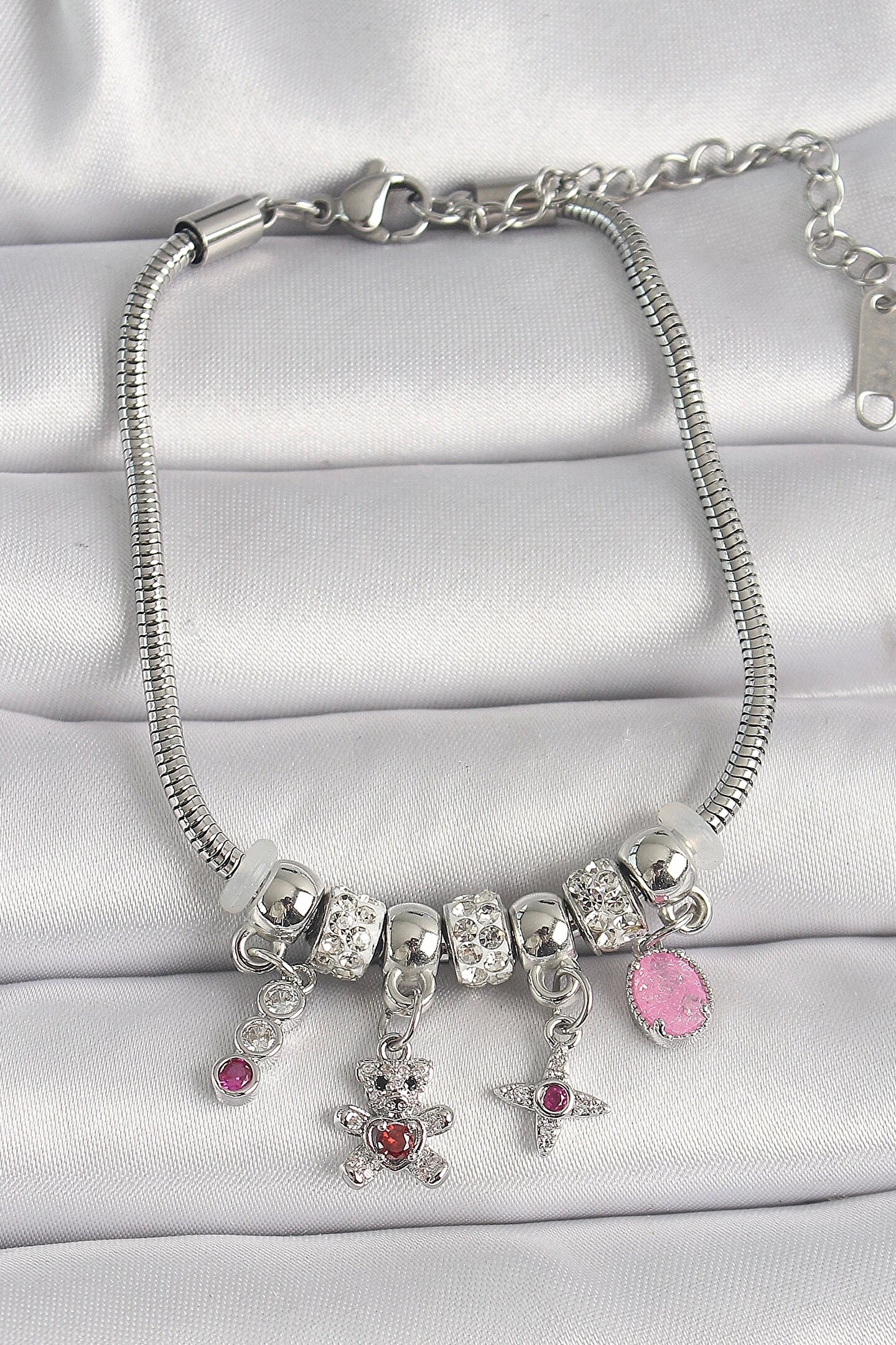 Clariss Pirinç Gümüş Renk Zincir Sallantı Zirkon Taşlı Ayıcık Figür Yıldız Detay Kadın Bileklik