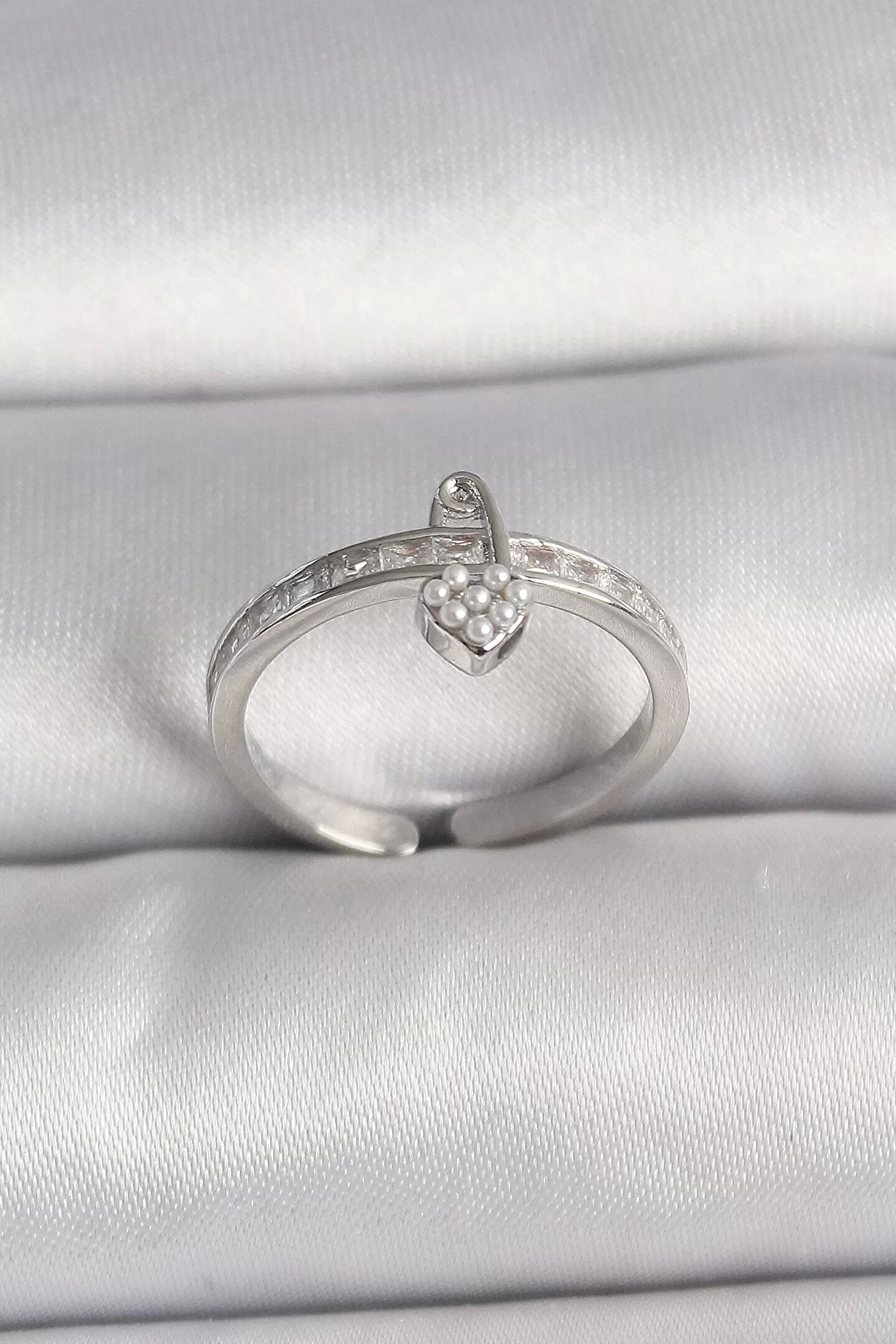 Clariss Pirinç Gümüş Renk Zirkon Taşlı İnci Detaylı Kilit Kalp Model Ayarlanabilir Yüzük