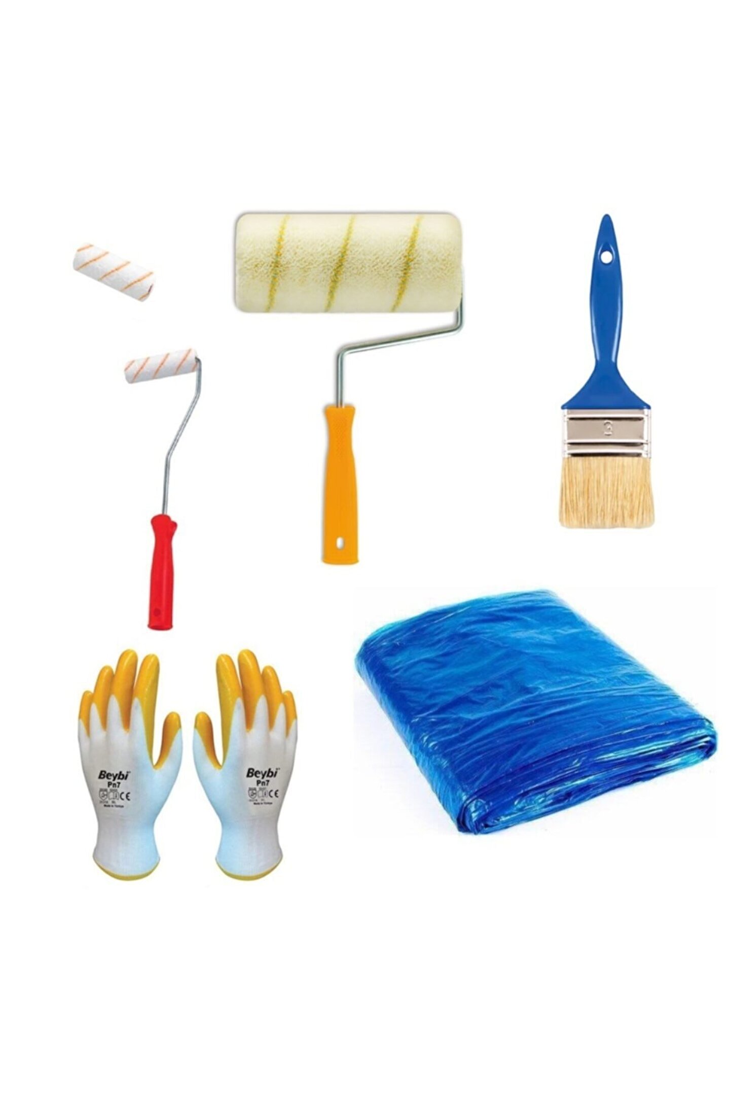 6 parça profesyonel boyacı seti Evinizde, işyerinizde veya ofisinizde boya badana yapmak için ihtiyaç duyacağınız tüm ürünler tek paket halinde sizlere sunulmuştur; Paket içeriği * 1 adet ince hışır boya örtüsü 10 m² * 1 adet 20 cm iç/dış cephe rulosu * 1 adet 3 no lüx kestirme fırçası * 1 adet 10 cm parmak boya rulosu *1 adet 10 cm parmak rulo yedeği * beybi pn 7 nitril eldiven;