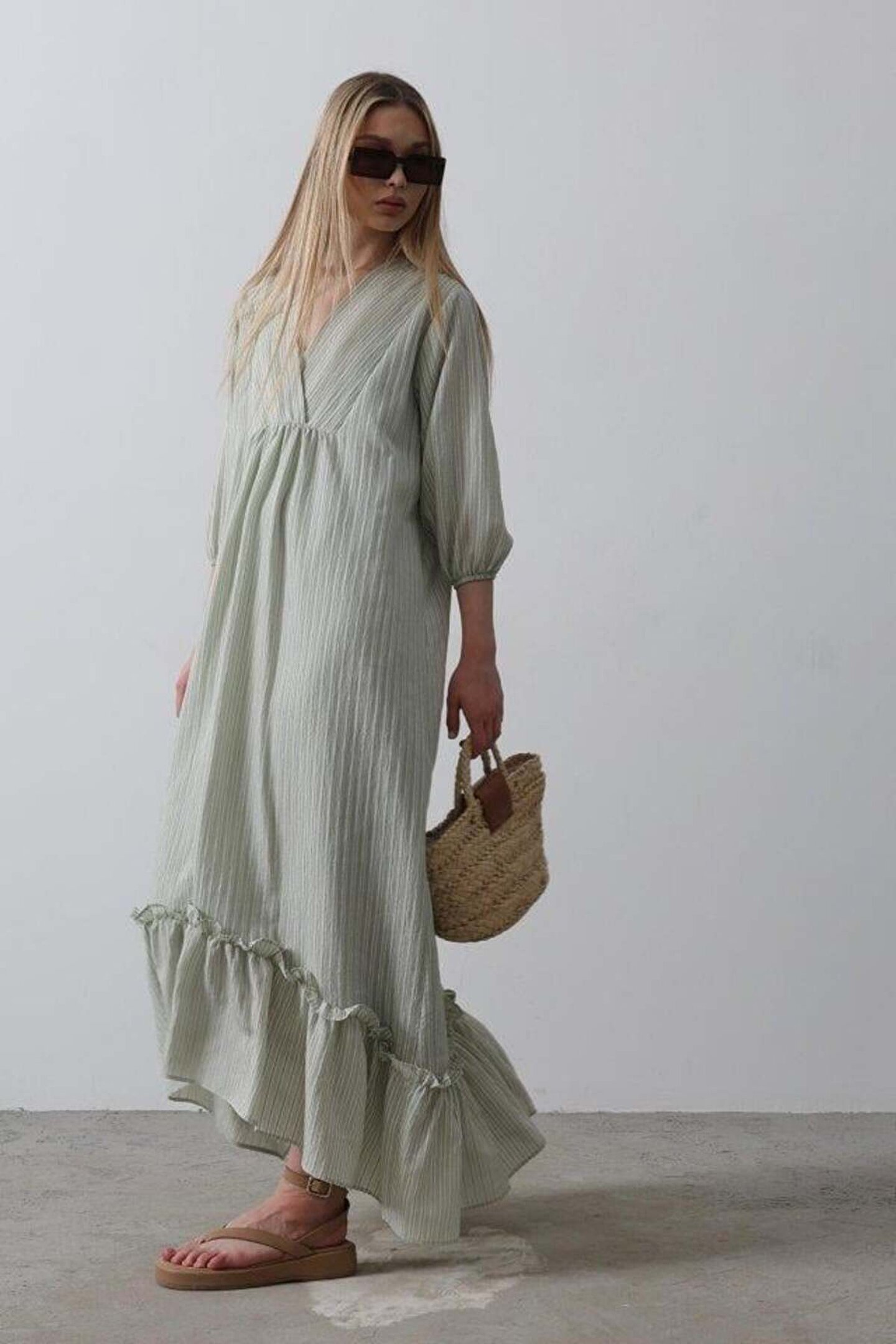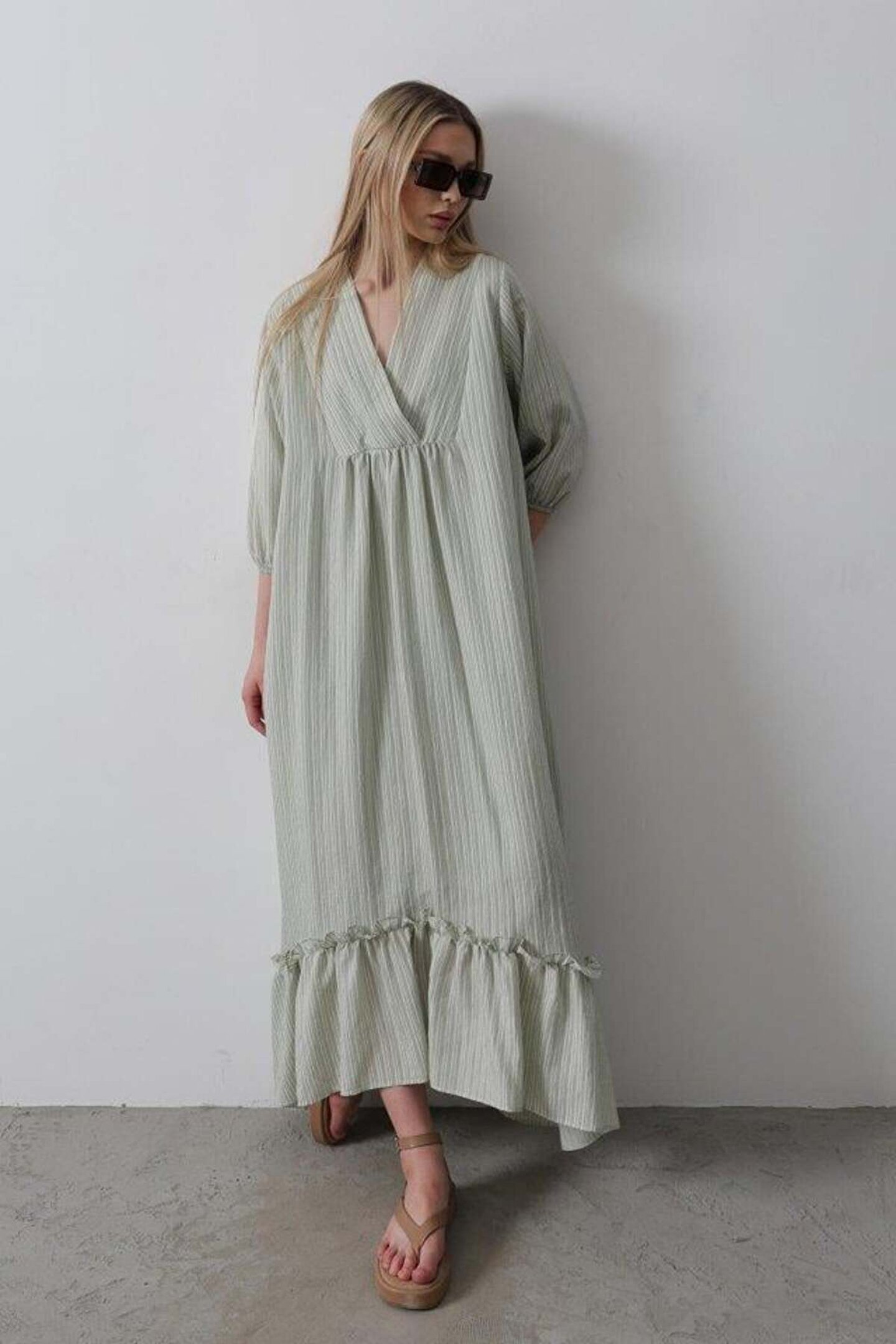 COjans Çizgili Oversize V Yaka Elbise - Haki