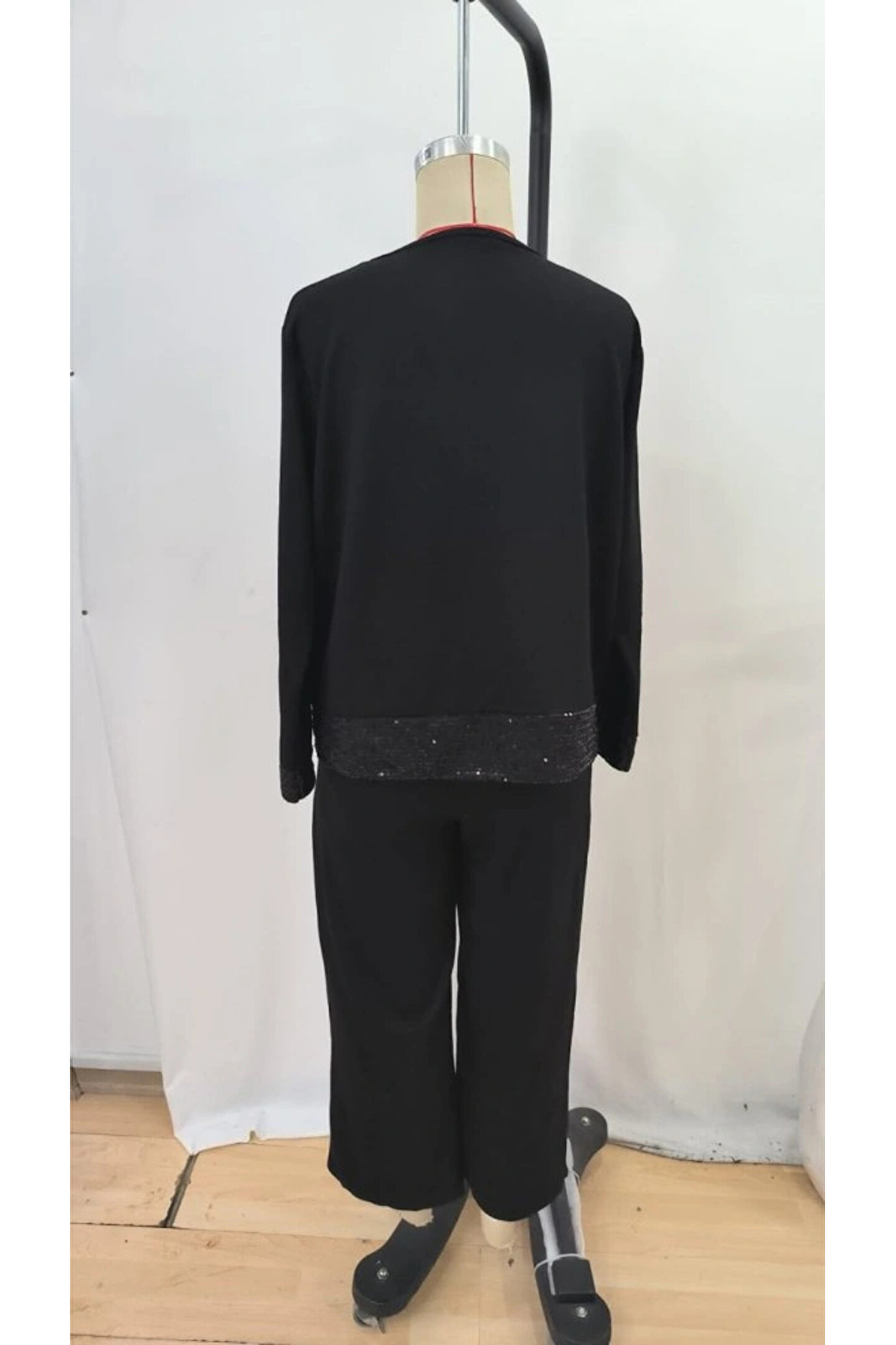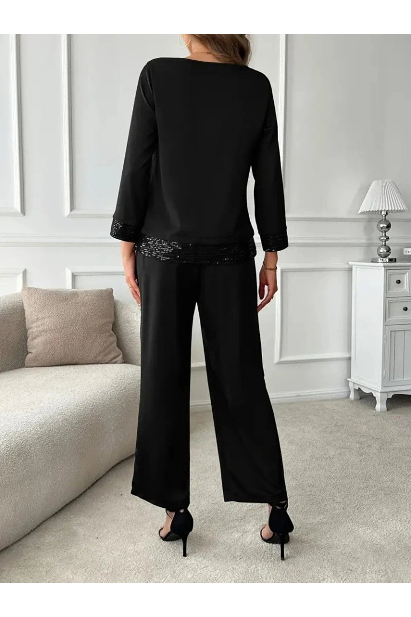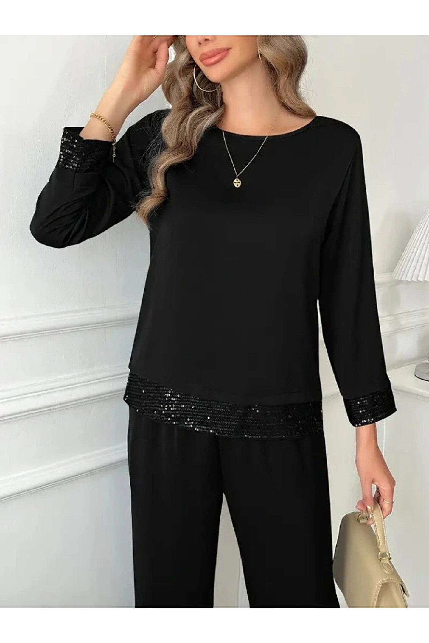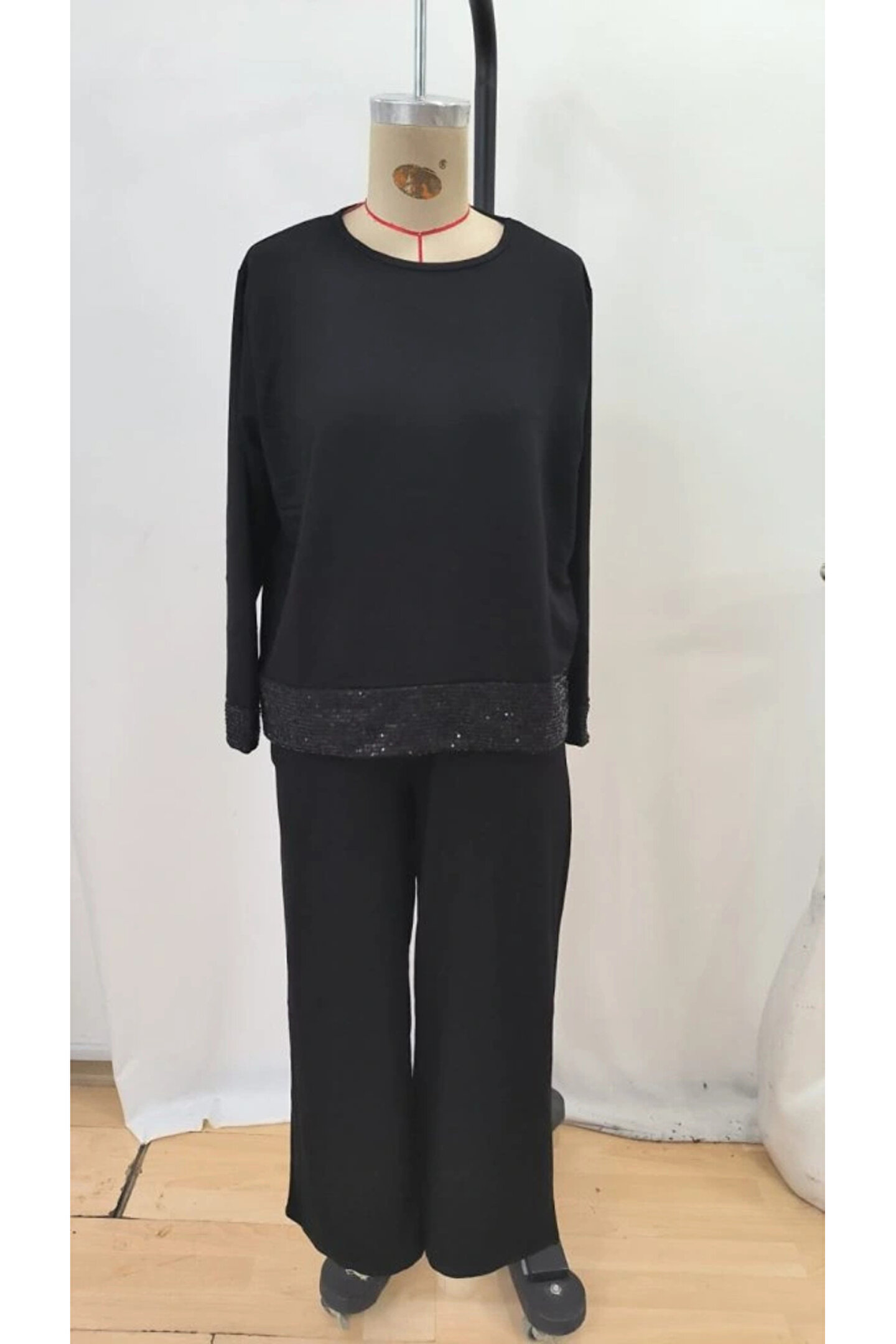 Kadın Uzun Kollu Bisiklet Yaka Pulpayetli Viskon Iki Iplik Bluz Ve Pantolon Ikili Takım