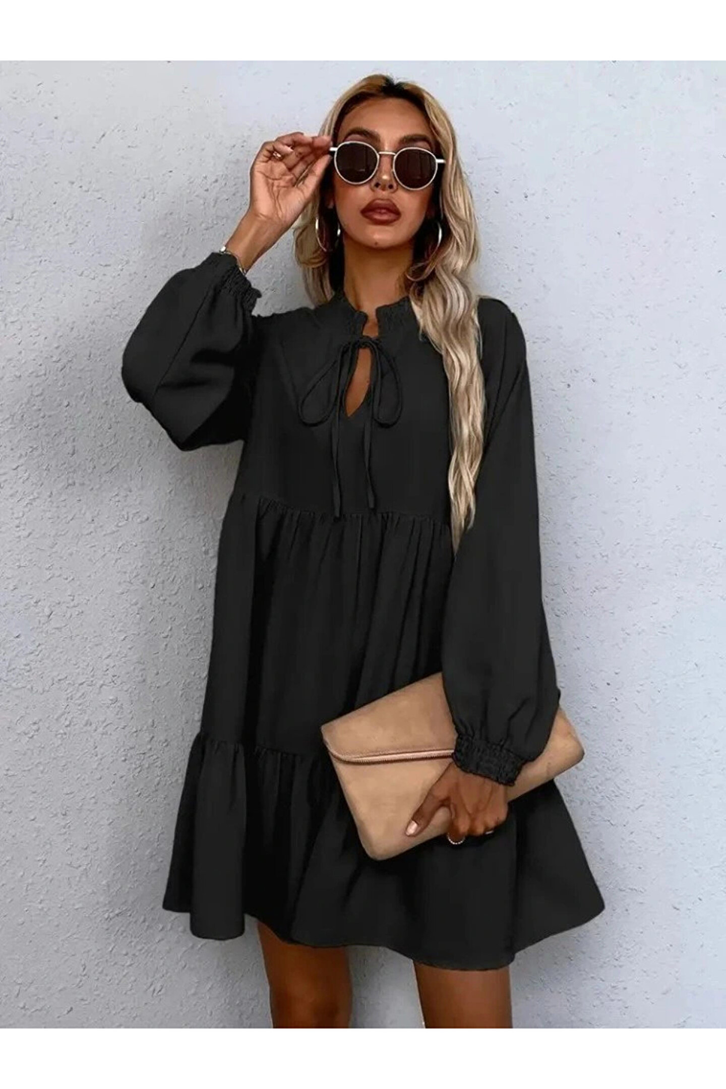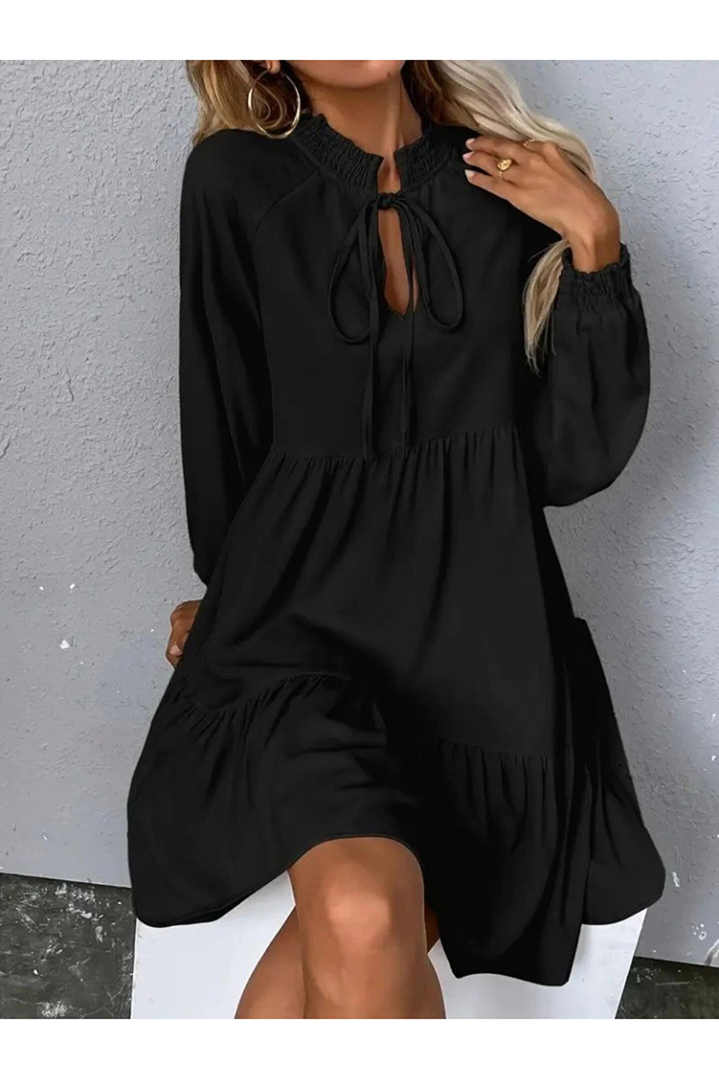Kadın Uzun Kollu Yakadan Bağcıklı Fırfırlı Keten Mini Elbise