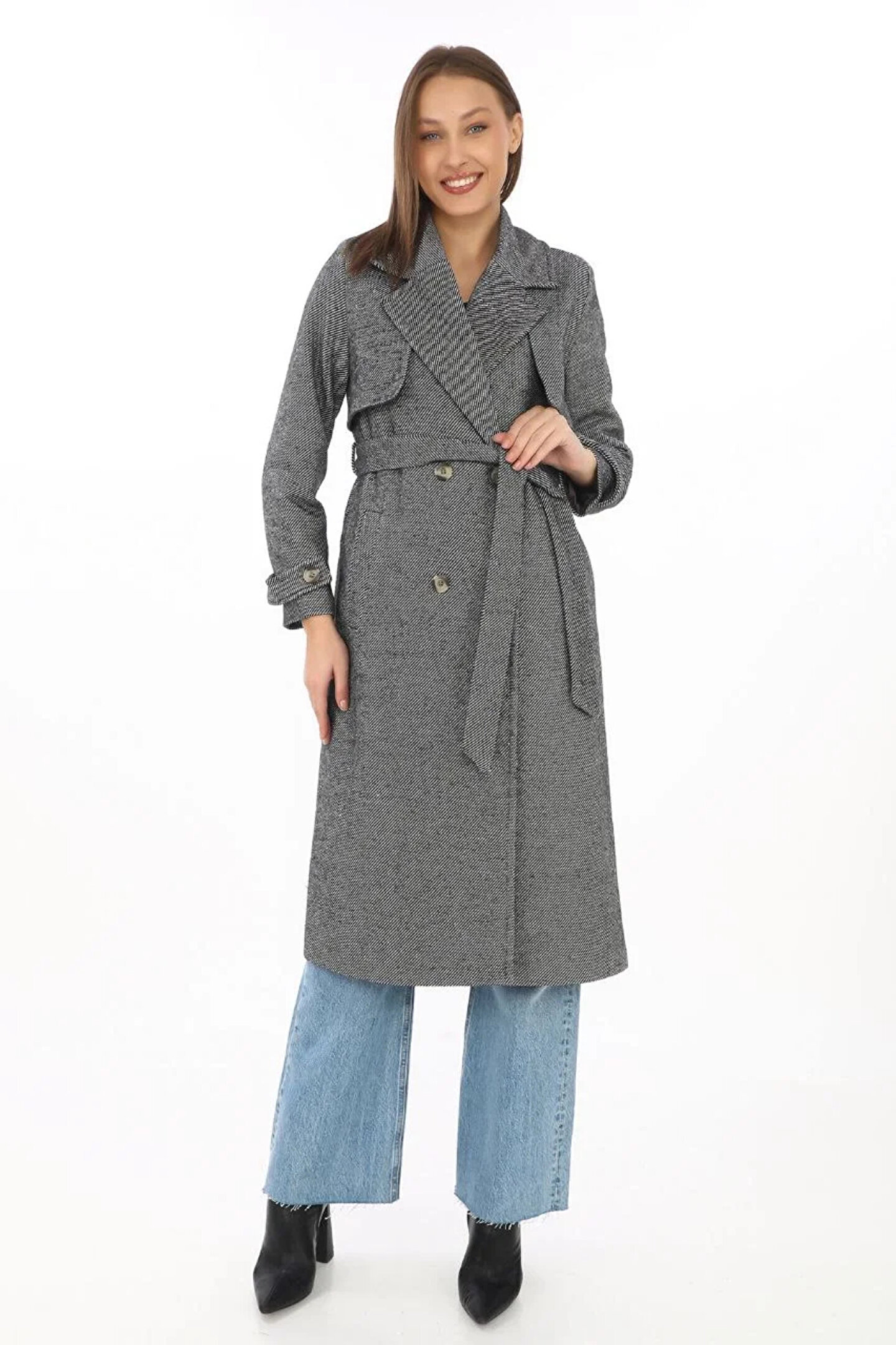 COjans Kadın Balık Sırtı Kaşmir Uzun Kaşe Kaban - Füme