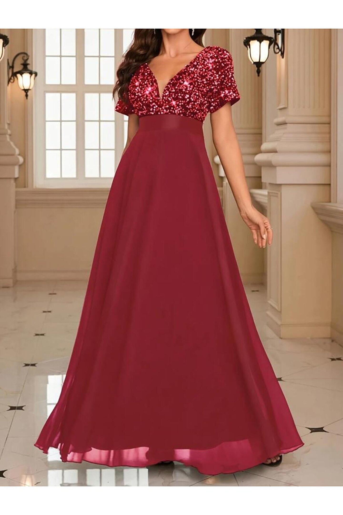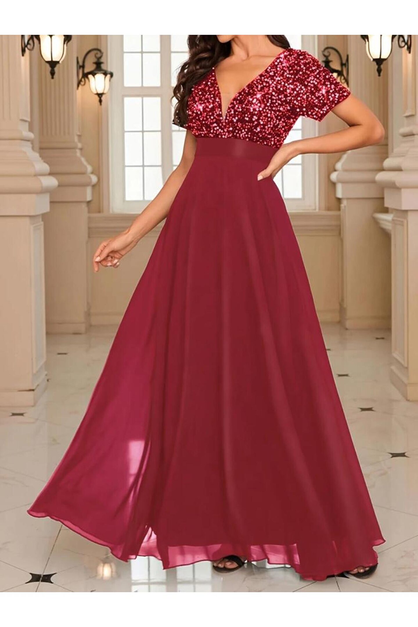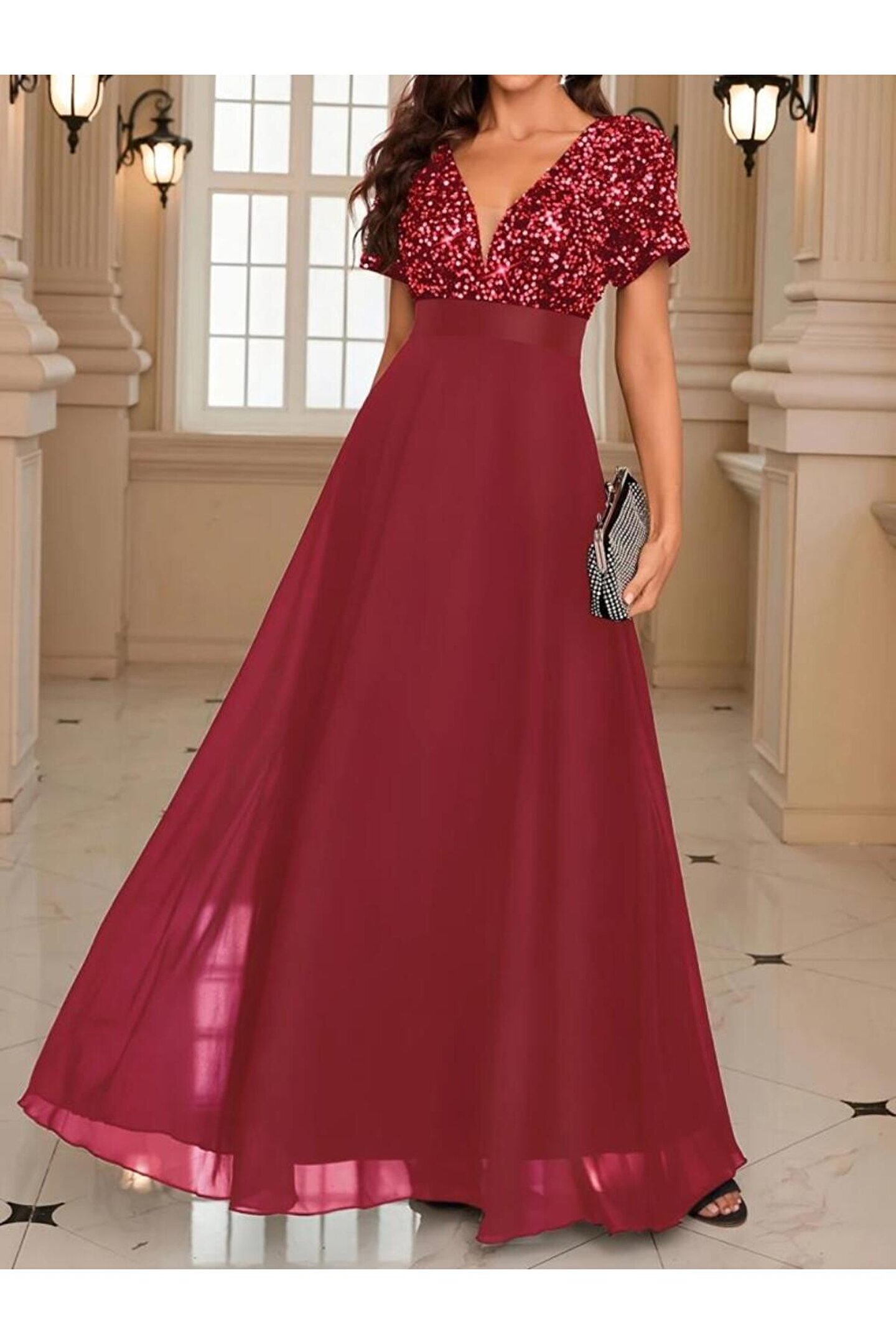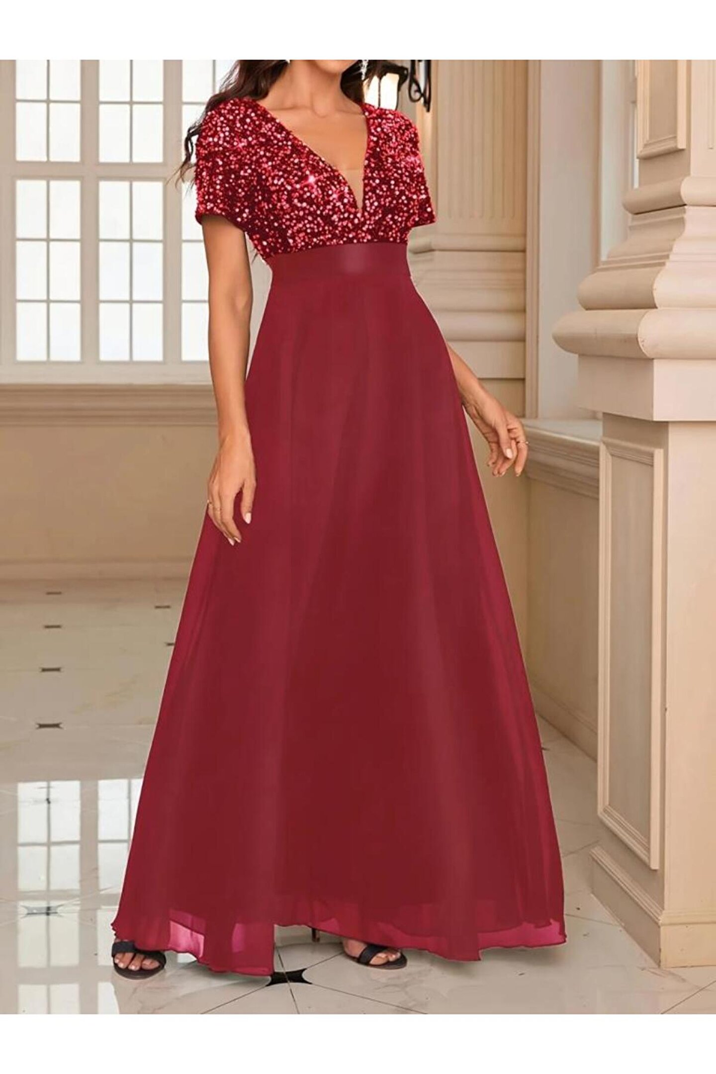 Kadın Kısa Kollu Derin V Yakalı A Kesim Pulpayet Detaylı şifon Nedime Elbisesi