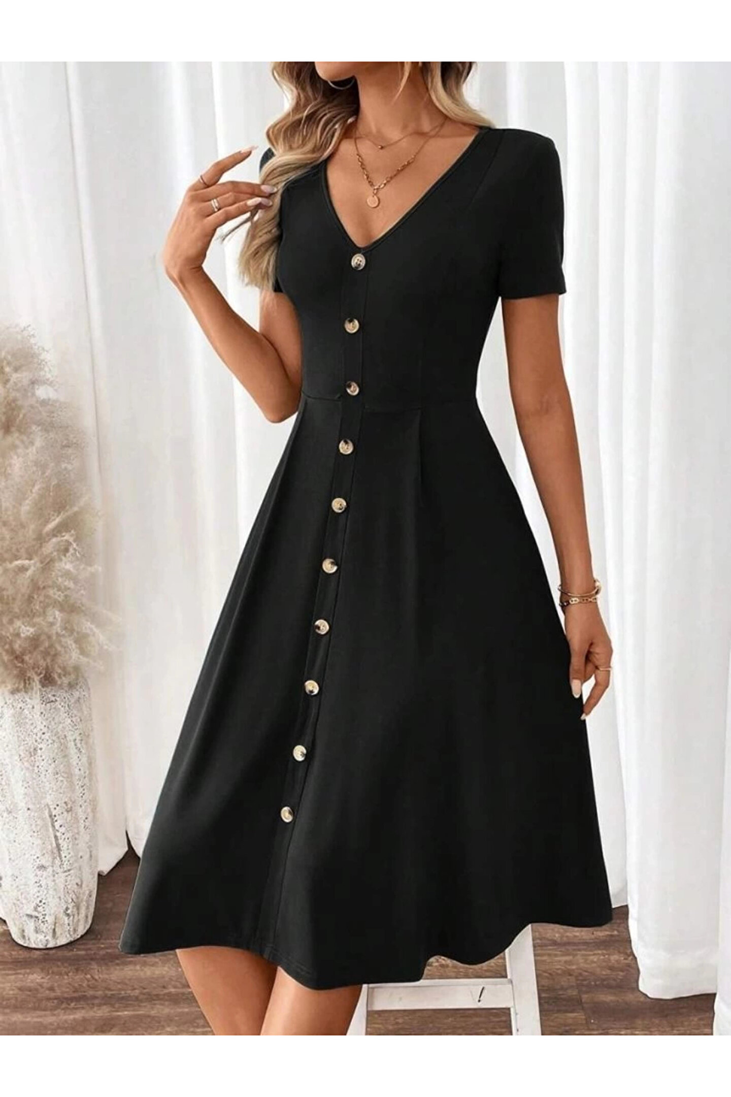 Kadın Kısa Kollu V Yakalı önden Düğmeli A Kesim Dokuma Elbise