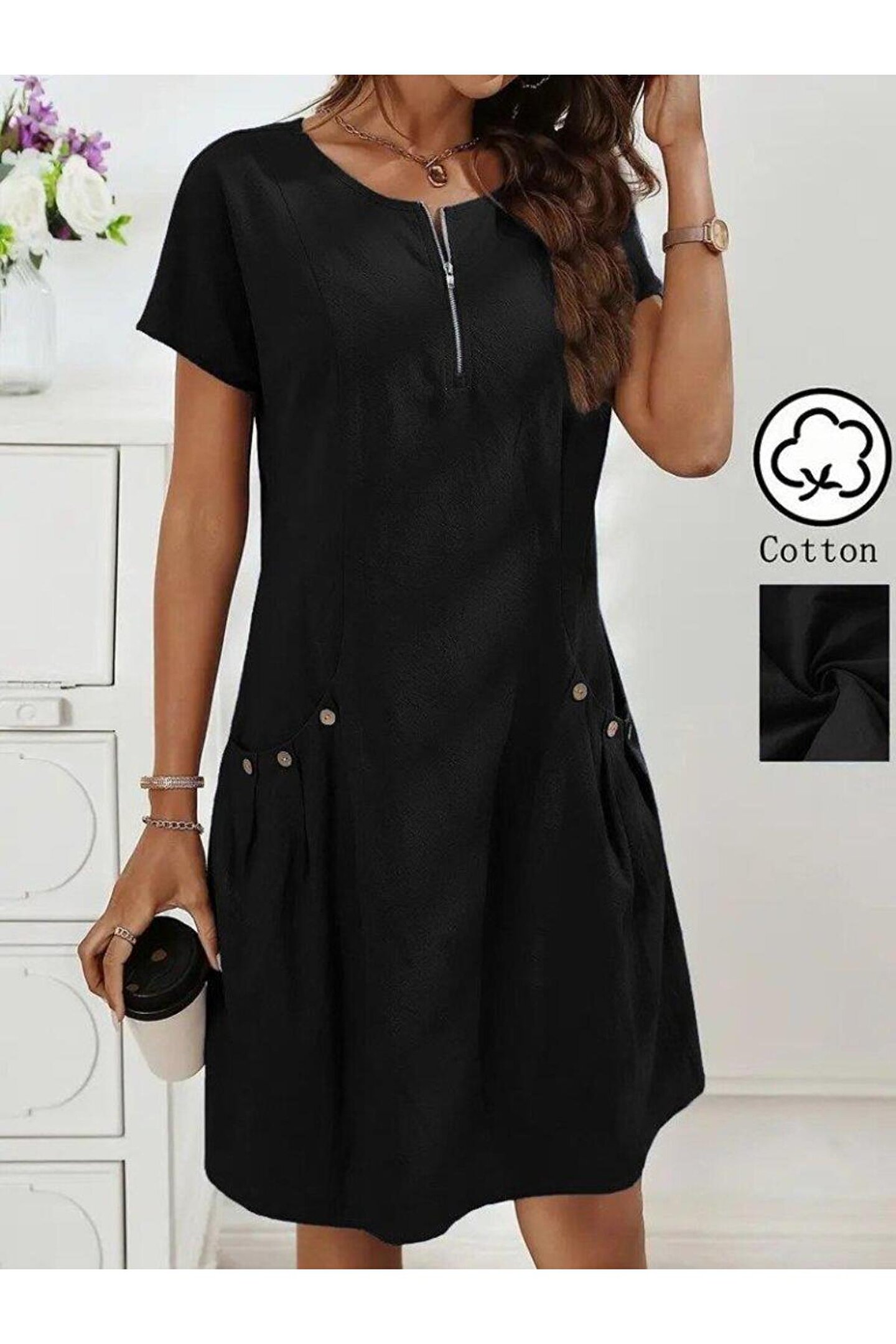 COjans Kadın Kısa Kollu Yakası Açık Fermuarlı Cep Detaylı Ithal Keten Elbise