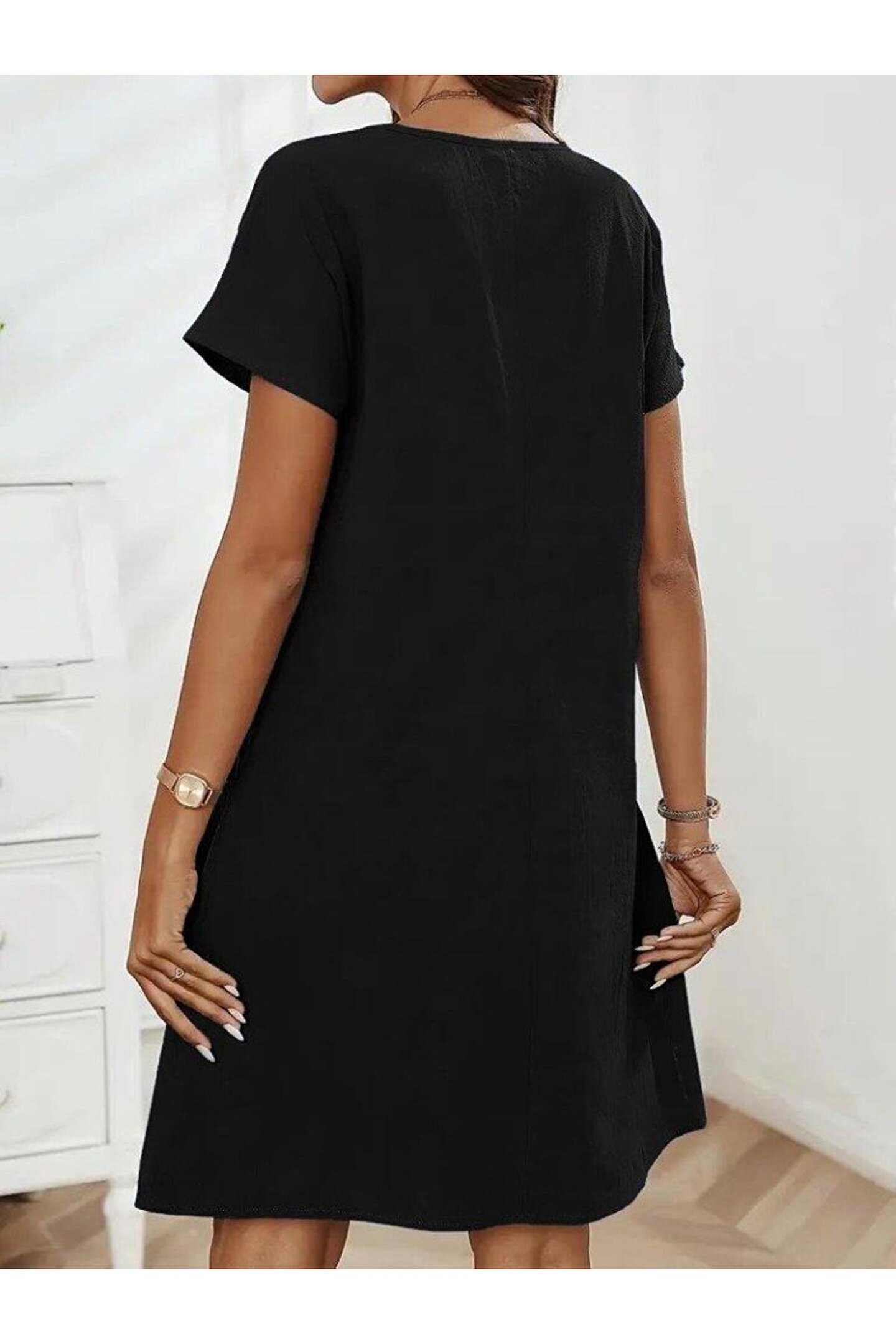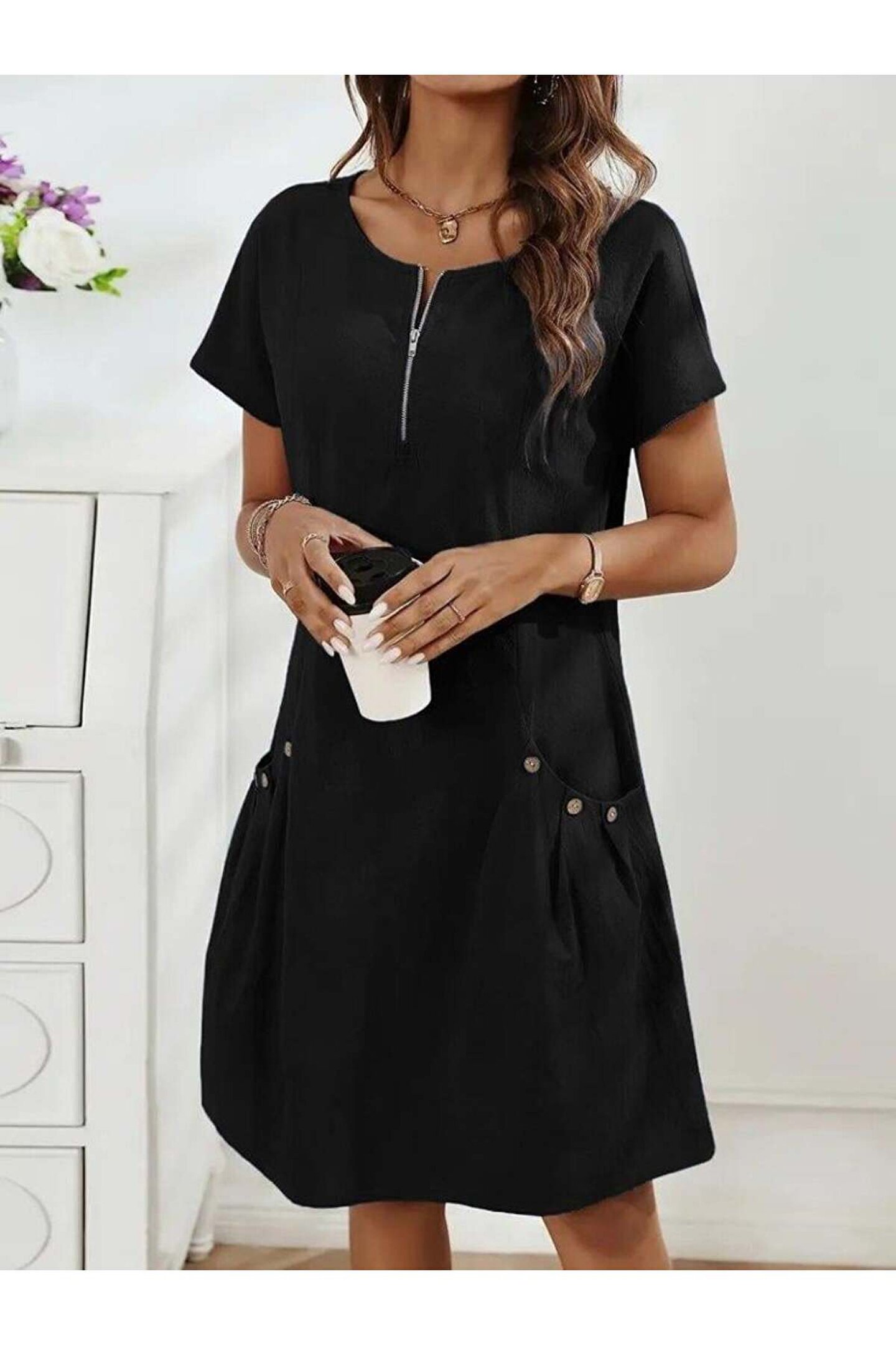 Kadın Kısa Kollu Yakası Açık Fermuarlı Cep Detaylı Ithal Keten Elbise