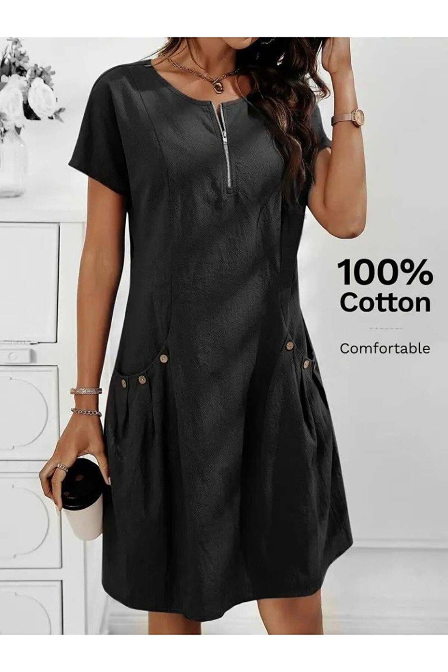 COjans Kadın Kısa Kollu Yakası Açık Fermuarlı Cep Detaylı Ithal Keten Elbise