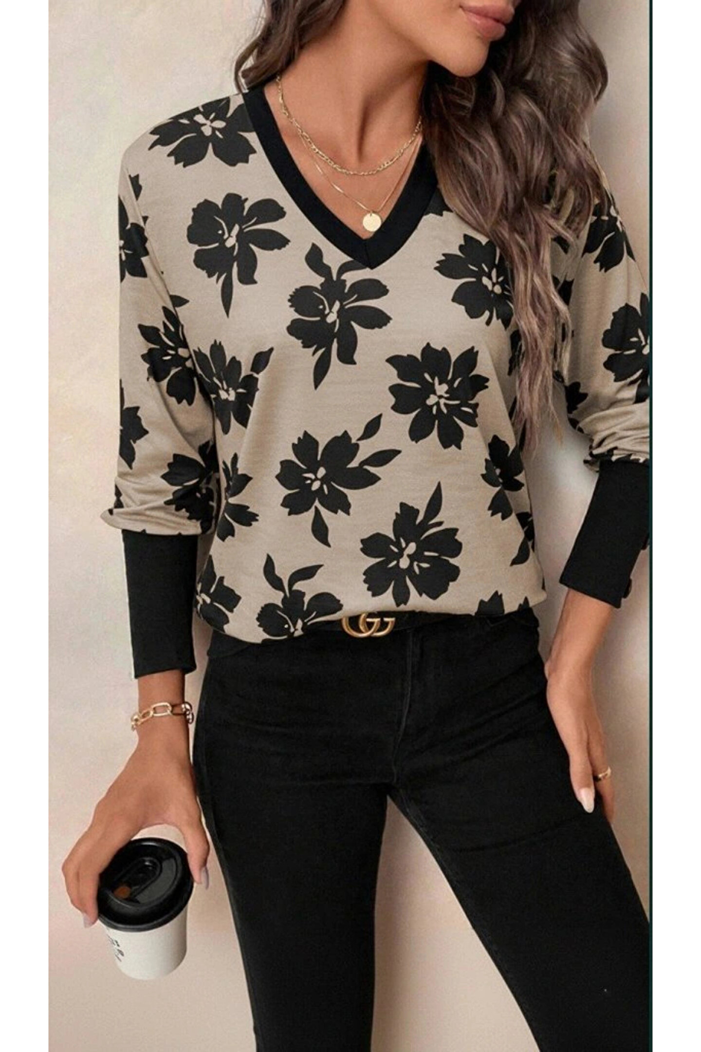Kadın Uzun Kollu V Yakalı Desenli Süprem Bluz