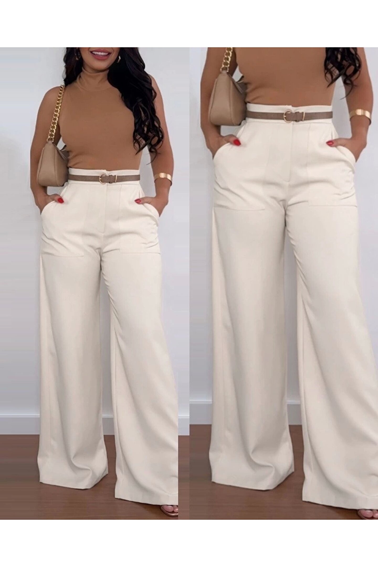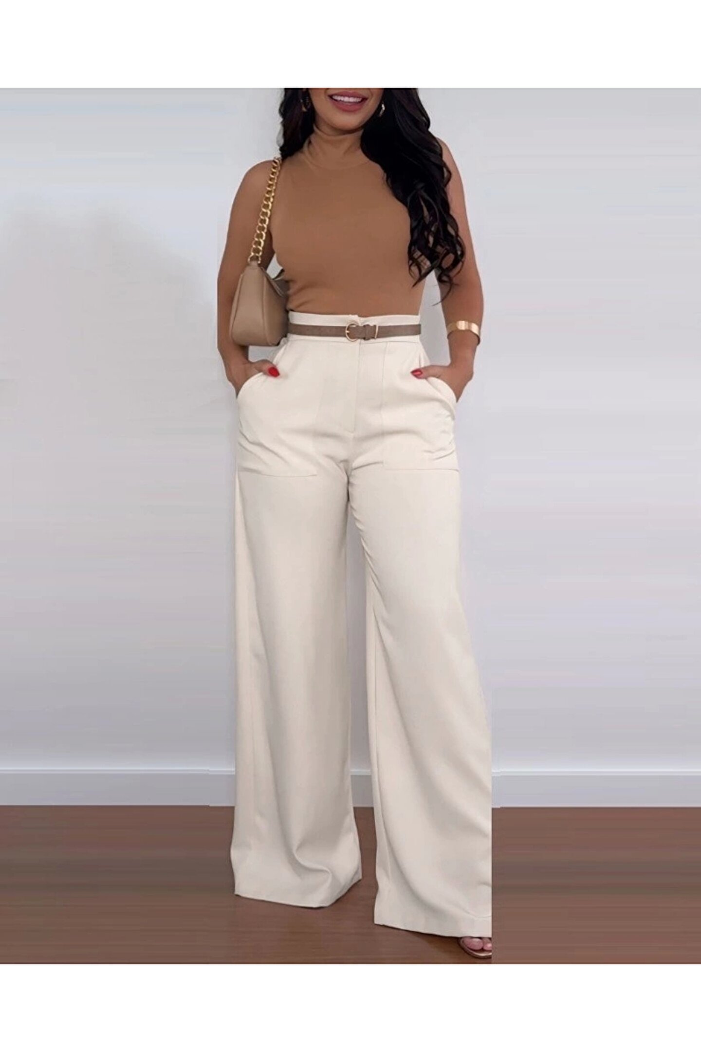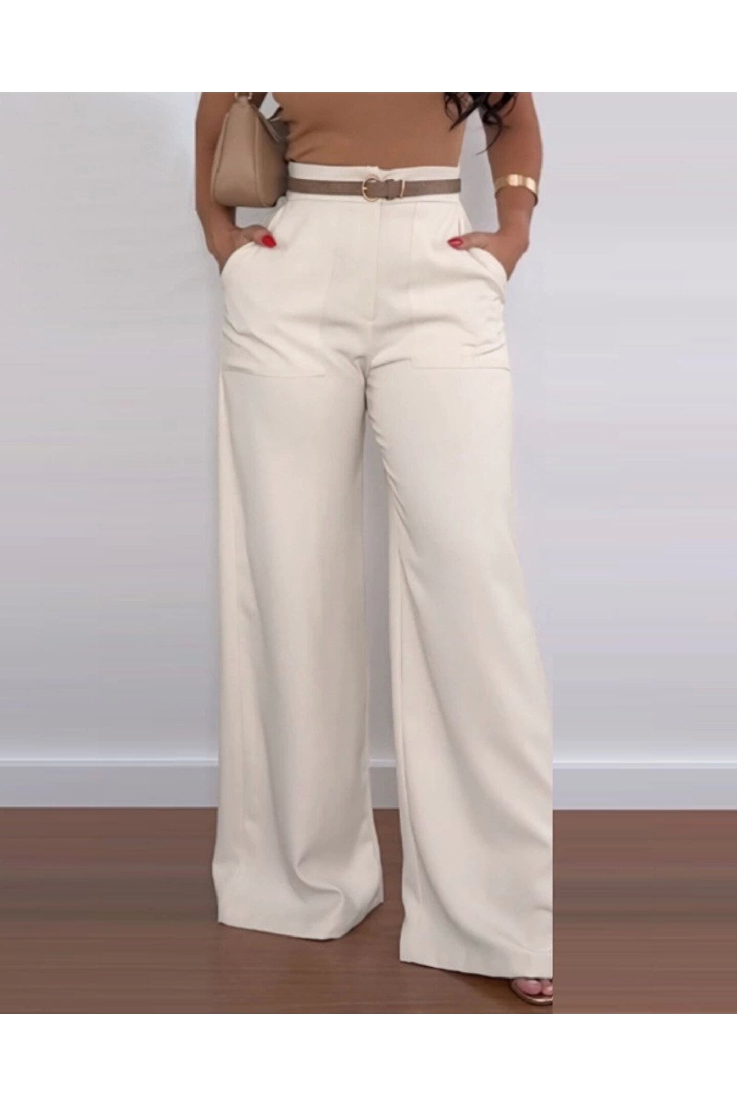 Kadın Yüksek Bel Geniş Paça Detaylı Cepli Ithal Krep Pantolon