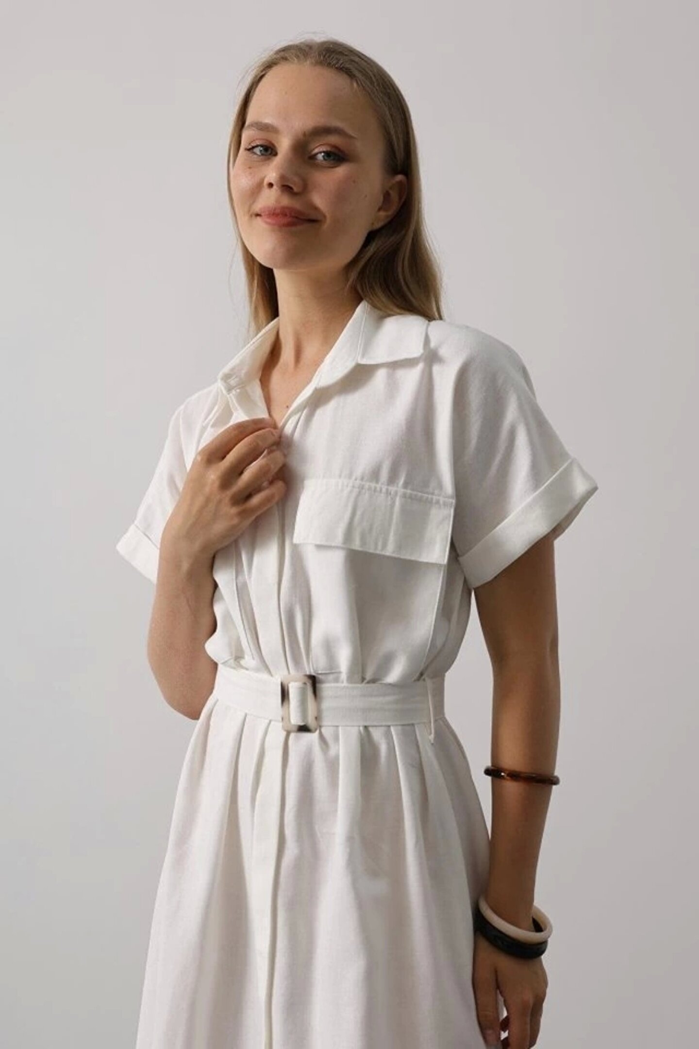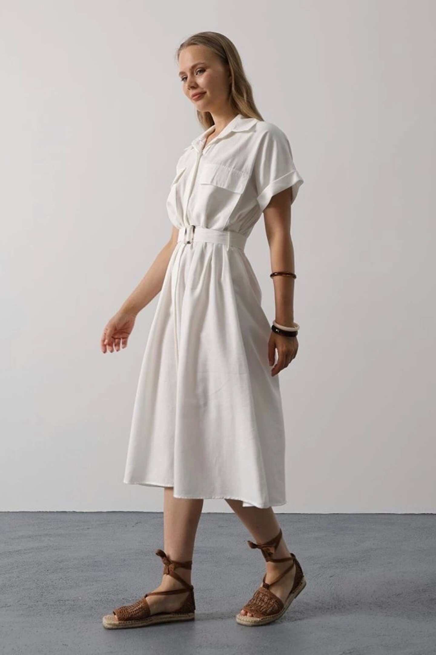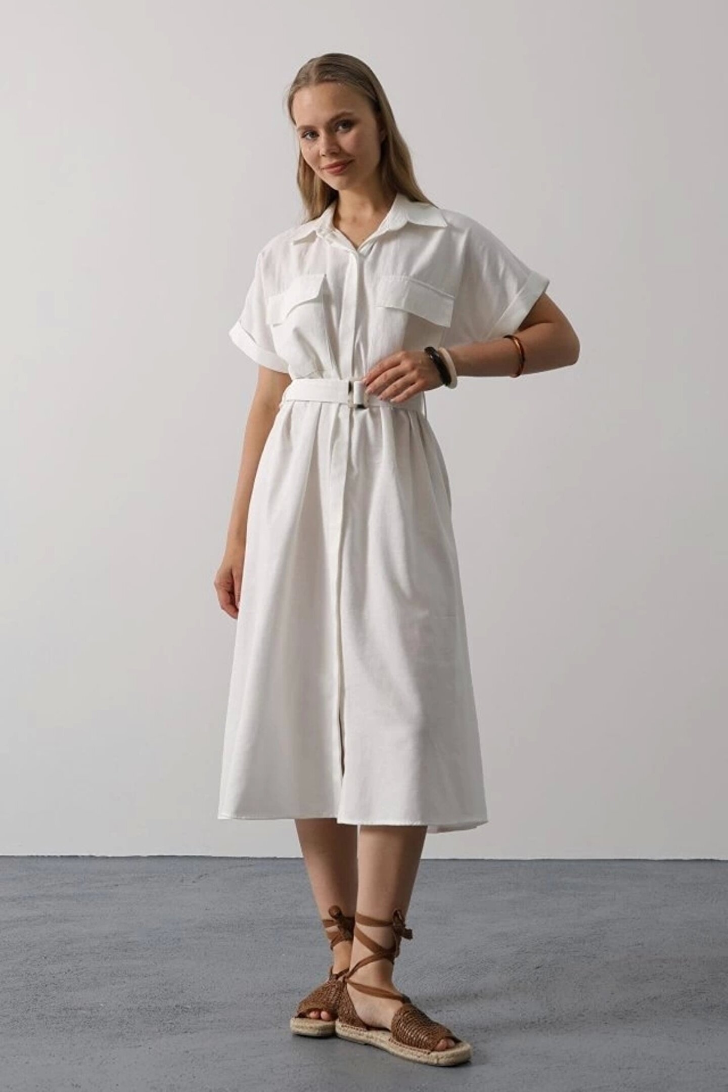 Kuşaklı Cep Detaylı Yarım Kol Elbise - Beyaz