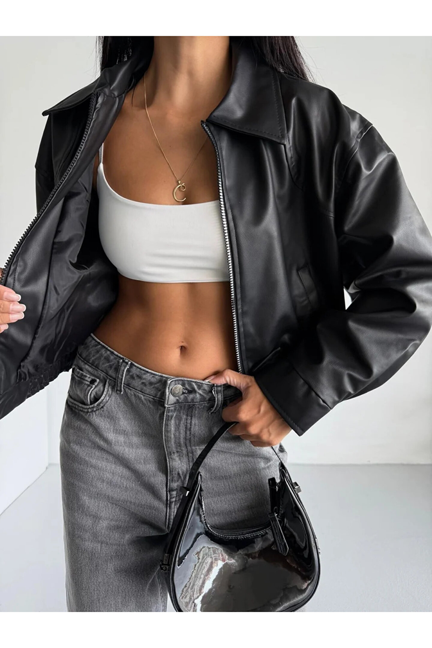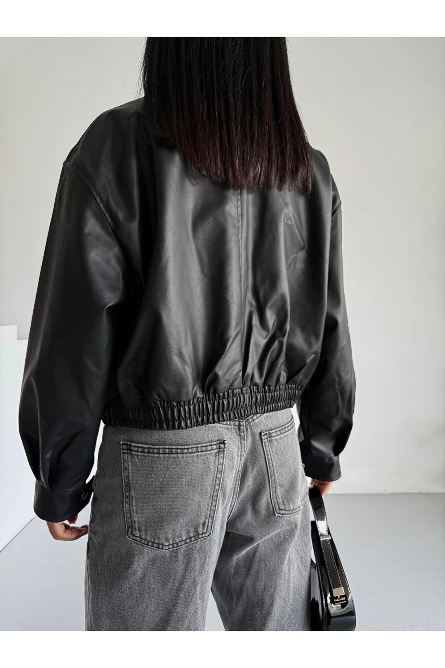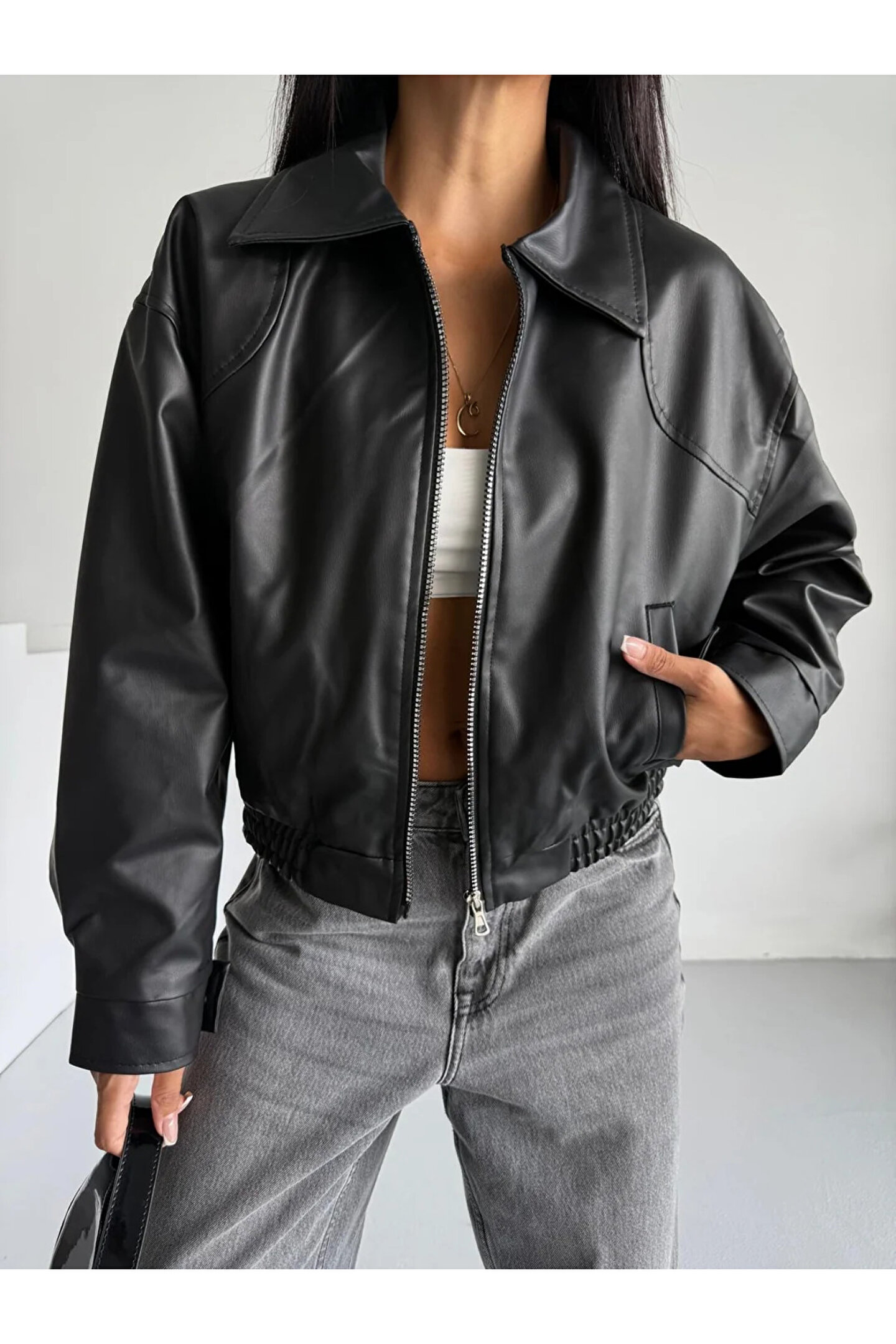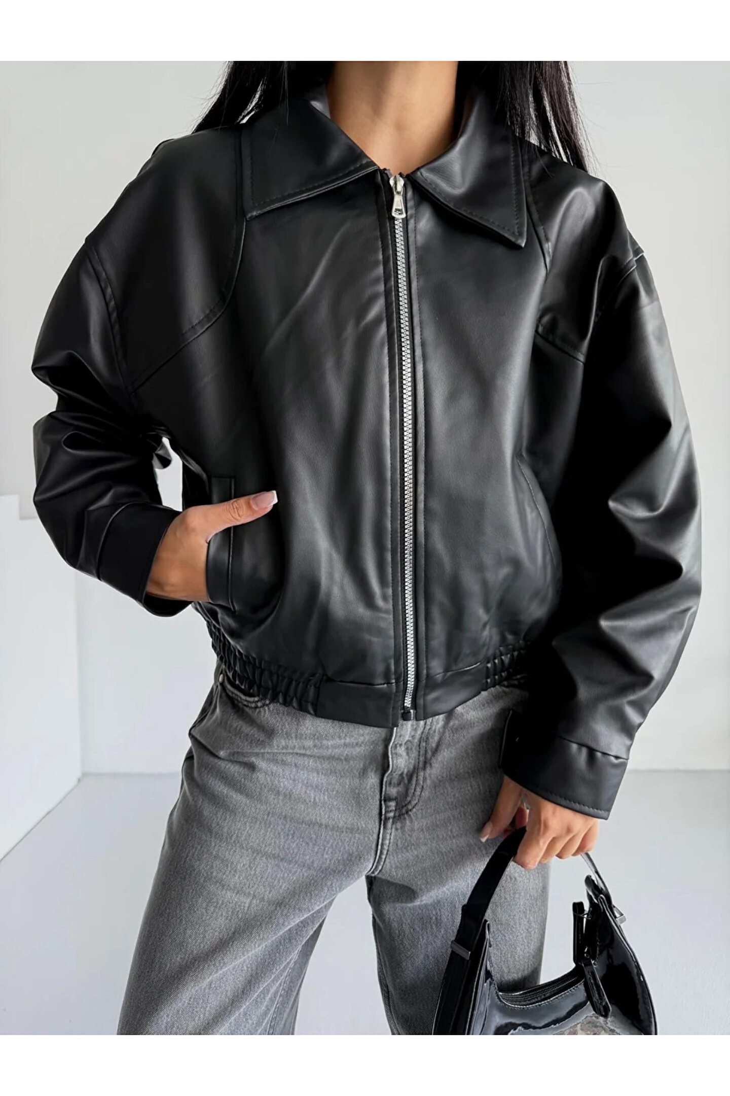 - Şık ve modern bir görünüm için siyah renkli, düz desenli suni deri bomber ceket.; - Uzun kollu tasarımı ile mevsim geçişlerinde ve serin havalarda konforlu bir kullanım sunar.; - Gömlek yaka detayı ile klasik ve zamansız bir stil yaratır.; - Çift cepli yapısı sayesinde günlük eşyalarınız için pratik saklama alanları sağlar.; - Casual ortamlarda rahatlıkla tercih edebileceğiniz, günlük kullanım için idealdir.; - Su itici özelliği ile yağmurlu havalarda bile kuru kalmanızı sağlar.; - Fermuarlı kapama şekli kolay giyilip çıkarılabilirlik sunarken şıklığı da korur.; - Tüm sezonlar boyunca rahatlıkla giyilebilecek orta kalınlıkta kumaşa sahiptir.; - Lastikli bel tasarımı sayesinde vücut hatlarınıza mükemmel uyum sağlar ve rahat bir oturuş sunar.; - Yetişkin kadınlar için özel olarak tasarlanmış, cool & comfort persona ile tarzınızı ön plana çıkarır.; - Bomber siluetiyle trend bir görünüm kazandırırken standart boy uzunluğuyla her vücut tipine uyum sağlar.;