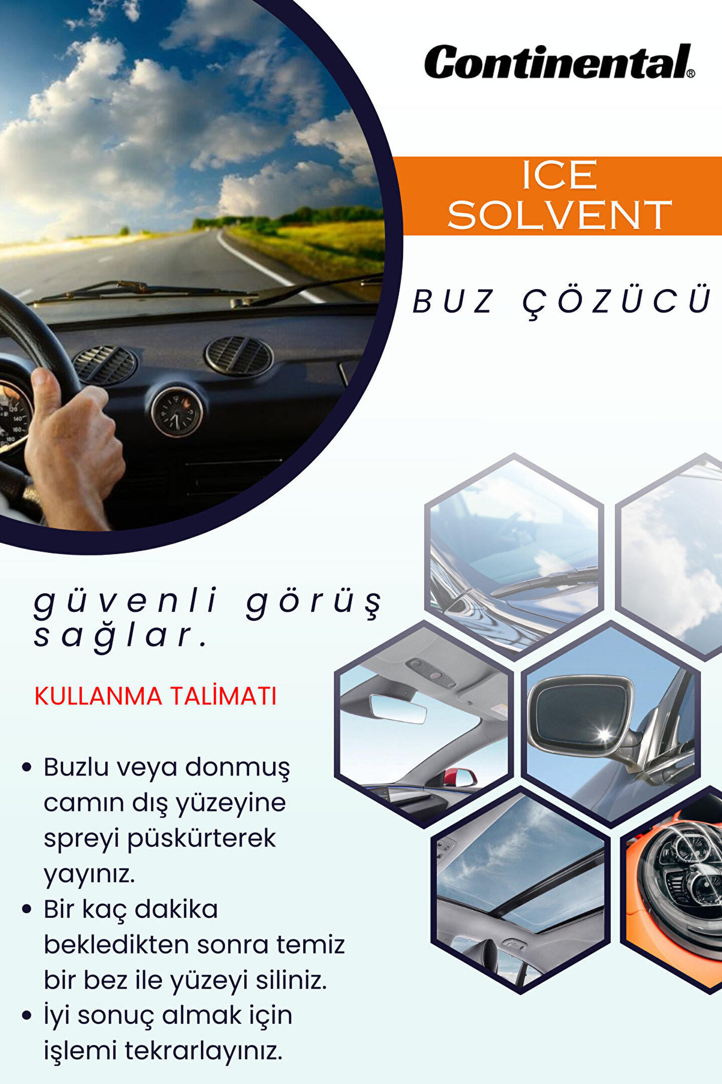 CONTINENTAL ıce solvent buz çözücü sprey soğuk kış aylarında sizi buz kazıma zahmetinden kurtarır. Aracınızın camında oluşan buz ve kırağıyı kolayca çözer. Leke bırakmaz ve güvenli görüş sağlar. Aracınızın tüm camlarında, aynalarında ve kapı kollarında güvenle kullanabilirsiniz.