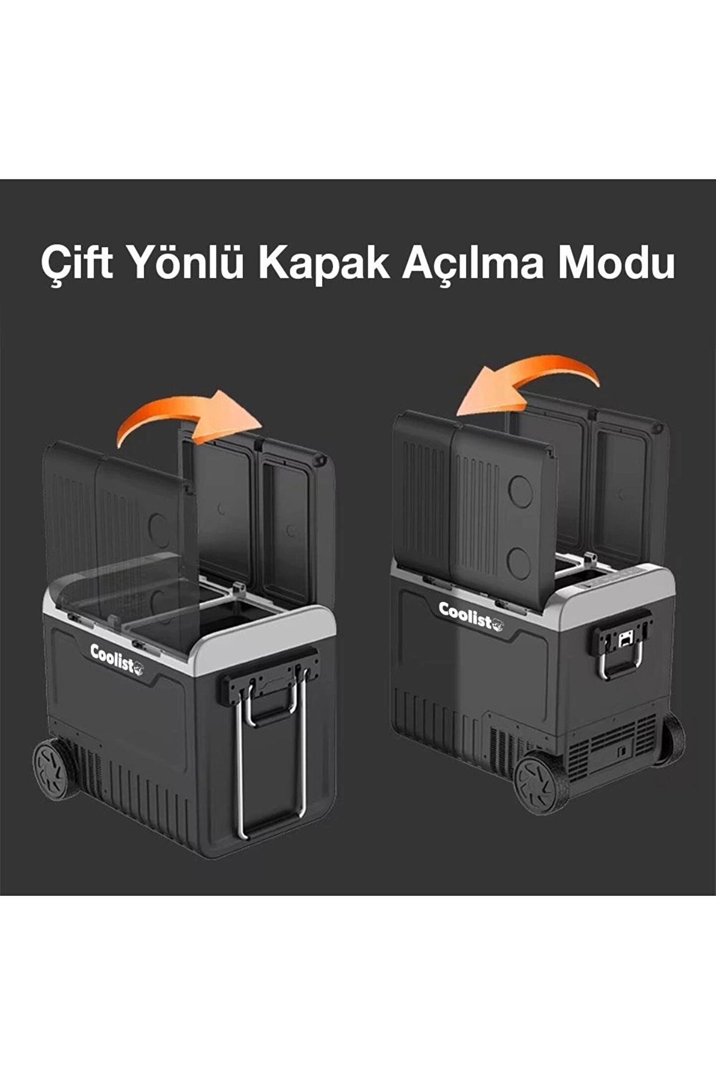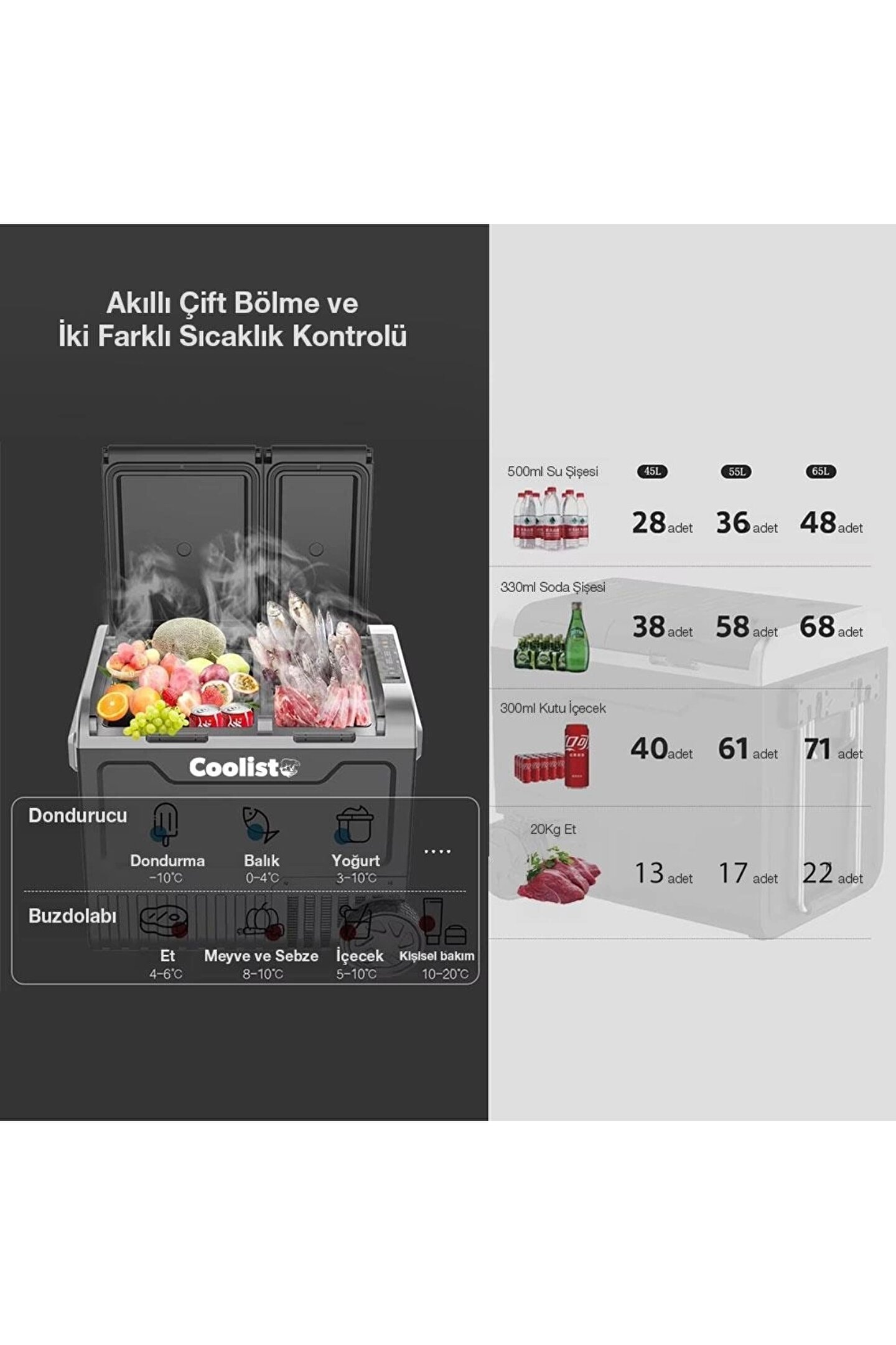 Coolist Kompresörlü Oto Buzdolabı/Dondurucu 65lt CLK65W Çalışma Gerilimi: 12V / 24V (araç çakmak girişi) & 220V (şebeke) Soğutma Kapasitesi: -20°C ila +20°C arası Hacim: 65 litre (20L + 45L) Güç Tüketimi: 55W Ağırlık: 23,2 kg Temel Özellikler: Çift Bölme: 65 litre kapasite (20L + 45L) ve her iki bölme bağımsız sıcaklık ayarıyla kullanılabilir.; LED Aydınlatmalı Dokunmatik Dijital Ekran: Kolay sıcaklık ayarı, akü koruma, ECO ve MAX modları.; Hızlı Soğutma: 20 dakikada oda sıcaklığından 0°C'ye kadar soğutma.; Çift Bölmeli Kullanım: Her iki bölme bağımsız olarak soğutucu veya dondurucu olarak kullanılabilir.; Süper Soğutma: -20°C’ye kadar dondurma, +20°C’ye kadar ısıtma imkânı.; Dış Ölçüleri: Genişlik:47,5cm Yükseklik:65cm Uzunluk:63cm İç Soğutucu Hazne Ölçüleri 1. Bölme: 34cm x 17cm x 33cm (20Lt.; ) İç Soğutucu Hazne Ölçüleri 2. Bölme: 51cm x 27cm x 33cm (45Lt.; ) Yüksek Verimlilik: ECO ve MAX seçenekleri ile enerji tasarrufu ve hızlı soğutma.; Kompresör Teknolojisi: Ev tipi buzdolabı gibi yüksek performanslı, sessiz ve titreşimsiz çalışma.; Dayanıklı Yapı: Darbe, UV ışınları ve dış etkenlere karşı korumalı sağlam dış gövde.; Mobil Kullanım: 12V/24V araçlarda, 220V şebeke elektriğinde kullanım imkânı.; Kolay Taşıma: Tekerlekli, çekme kolu ve çift yönlü kapak tasarımı ile her zemin üzerinde rahat taşıma.; Geniş İç Hacim: Büyük şişeler için geniş alan, hijyenik ve kolay temizlenebilir iç yüzeyler.; Ev ve Ofis: 220V dönüştürücü adaptör ile evde kullanım.; Akü Koruma: Akü voltajı düşük olduğunda otomatik kapanır, voltaj normale döndüğünde tekrar başlar.; Yalıtım: PU köpük ve yalıtımlı kapaklar ile minimum ısı kaybı ve daha verimli soğutma/dondurma.