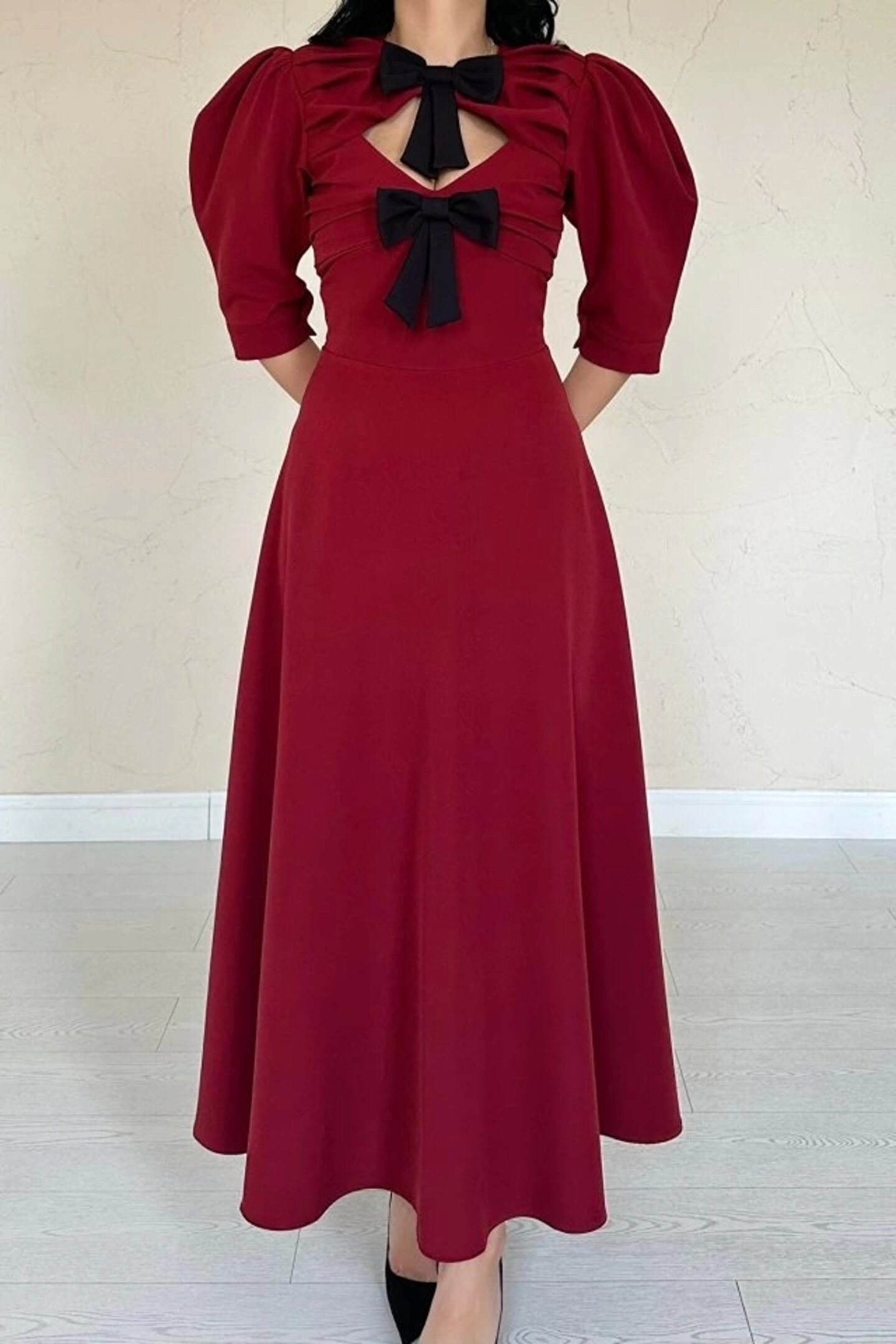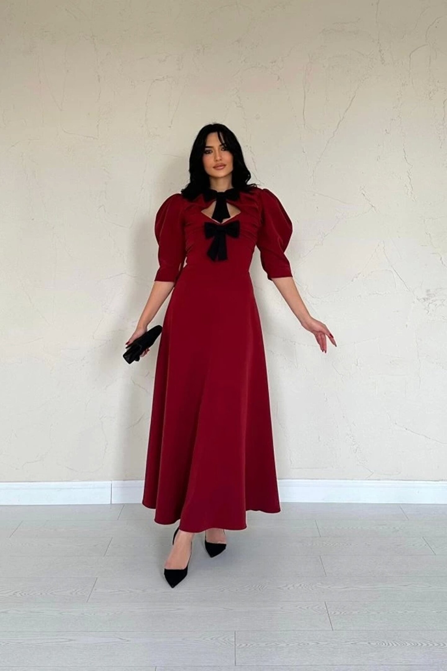 COTTONLAB Bordo Ön Dekolteli Fiyonk Garnili Uzun Elbise