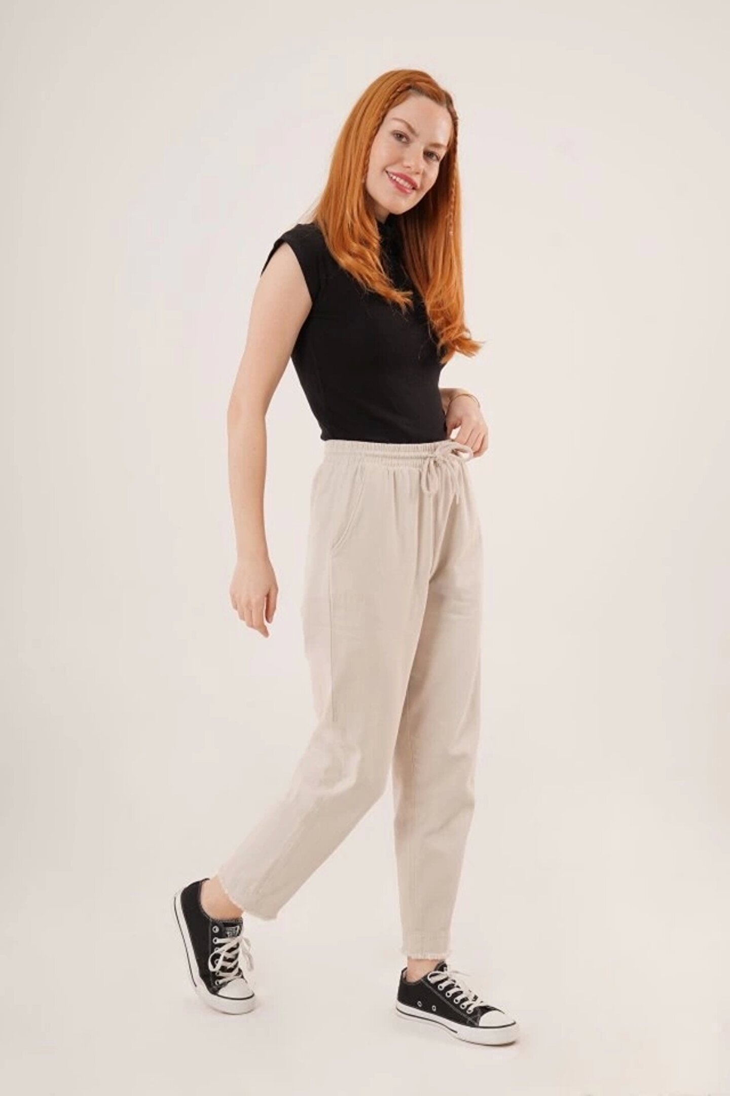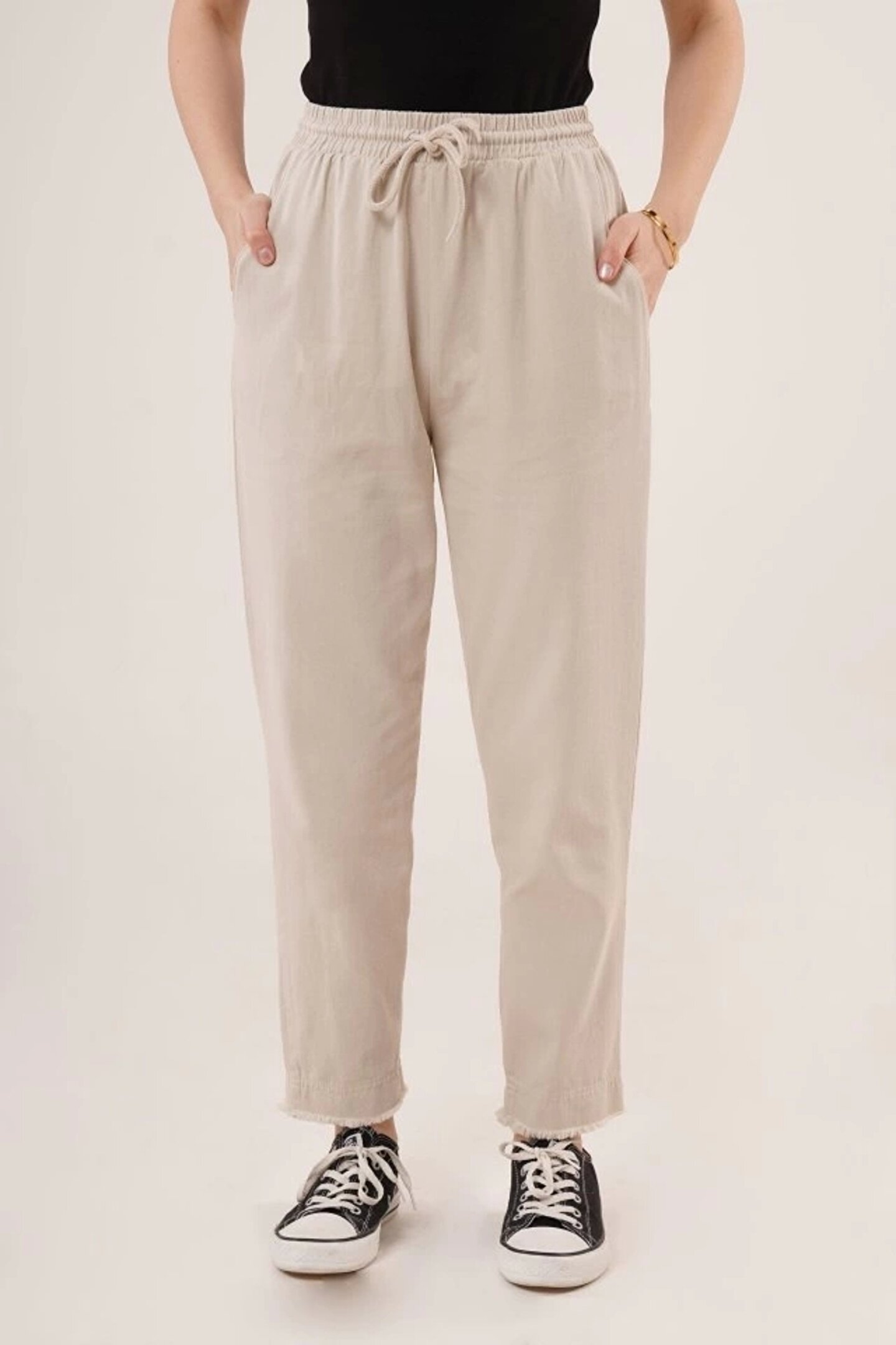 COTTONLAB Cepli Belden Bağlamalı Paça Detaylı Krem Pantolon